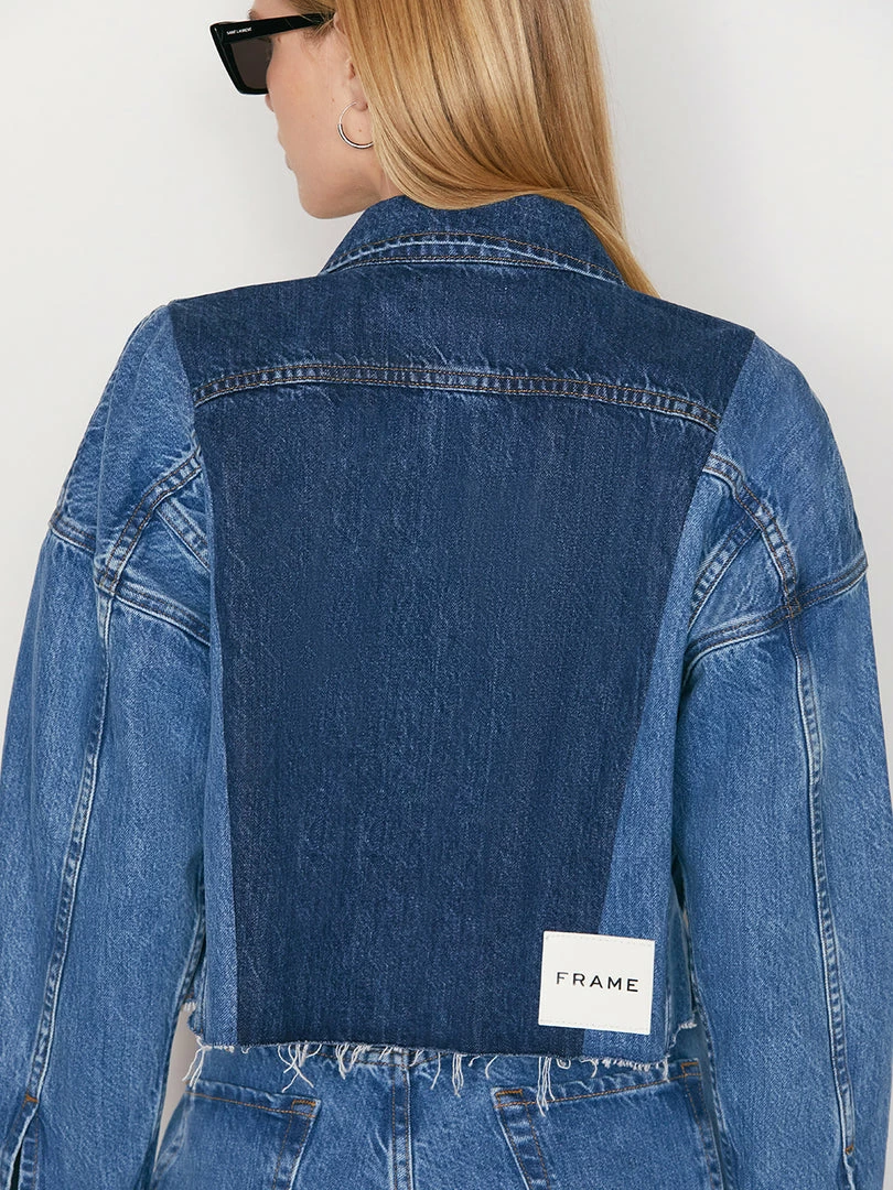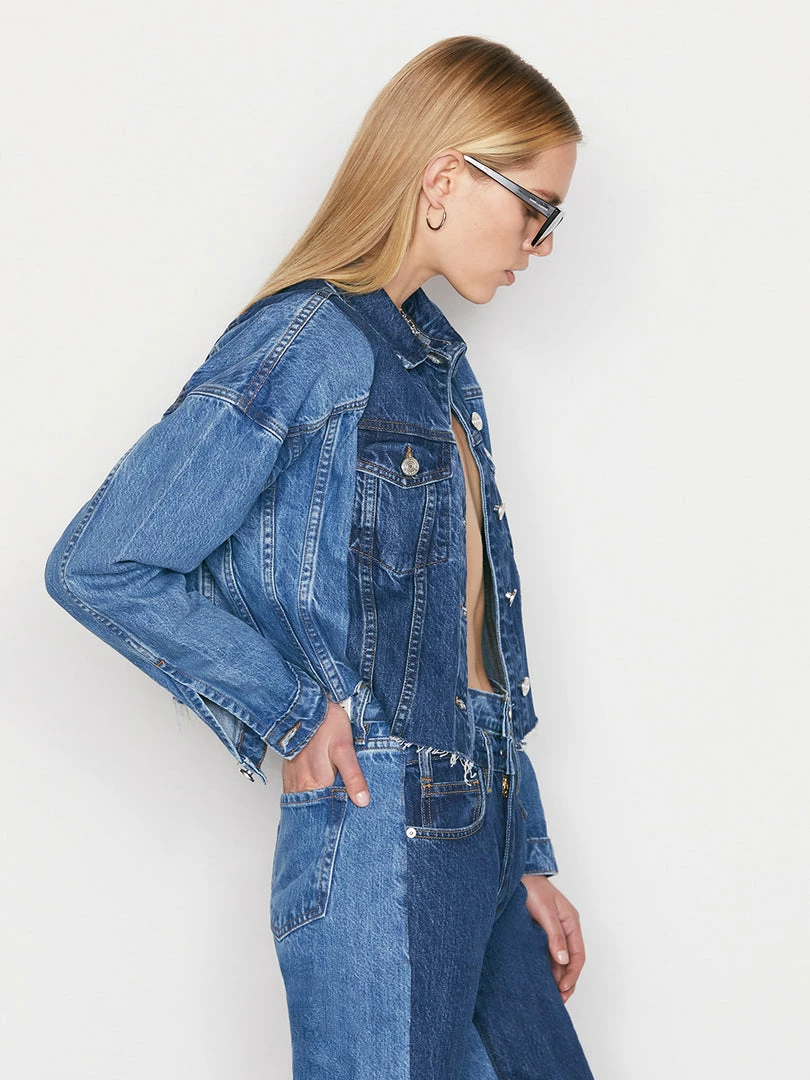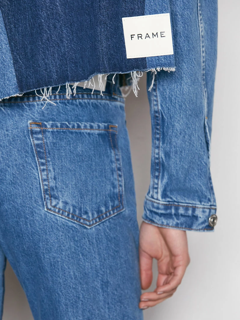 From FRAME Atelier, an elevated approach to nostalgic patchwork styling. Contrasting washesโone light, one darkโare pieced together for a fresh, textural take on the classic denim jacket. Style over a slim white tank with the matching denim pant, plus modern wedges for a singular after-dark denim look.