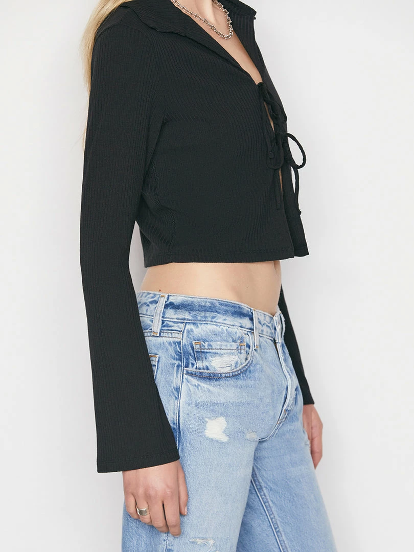 Luxuriously soft with a microrib texture, this cropped polo features two delicate ribbon ties. Style this piece solo for understated allure, or over a bodysuit or bralette to add feminine polish to your summer uniform. The flared bell sleeve gives this top a vintage feel, especially paired with wide-leg denim.