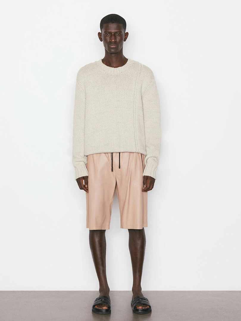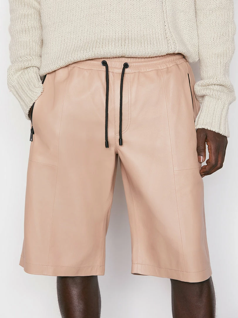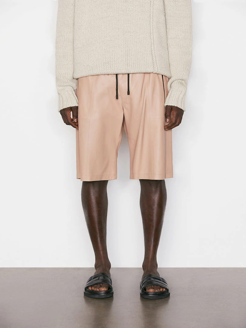 Seamed details elevate this leather short by subtly creating a tonal FRAME plaque on this 100% lambskin leather short. Featuring an elastic waist and side pockets, this short proves warm-weather dressing isnβt always laid-back. Pair yours with a tee, button-down, or the matching Brick leather shirt.