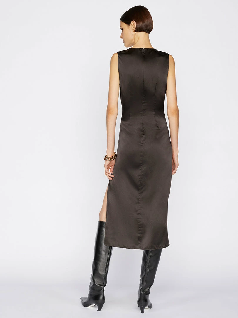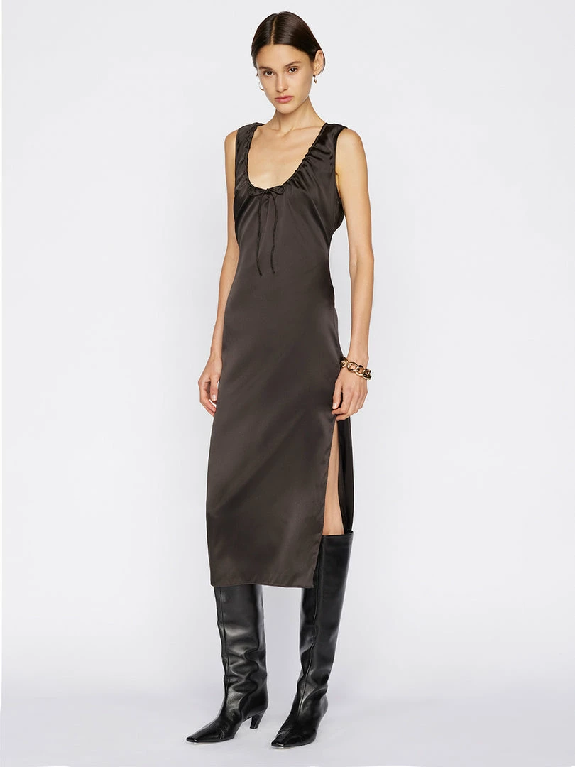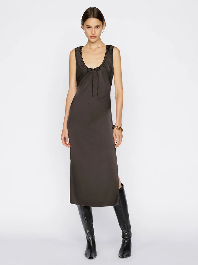 For ’90s supermodel style you can sport at the office, slip into this stretch silk scoop-neck midi. Cinched along the neckline, with a side slit and wide straps that stay put through even the most high-energy dance party, this silhouette has year-round styling potential.