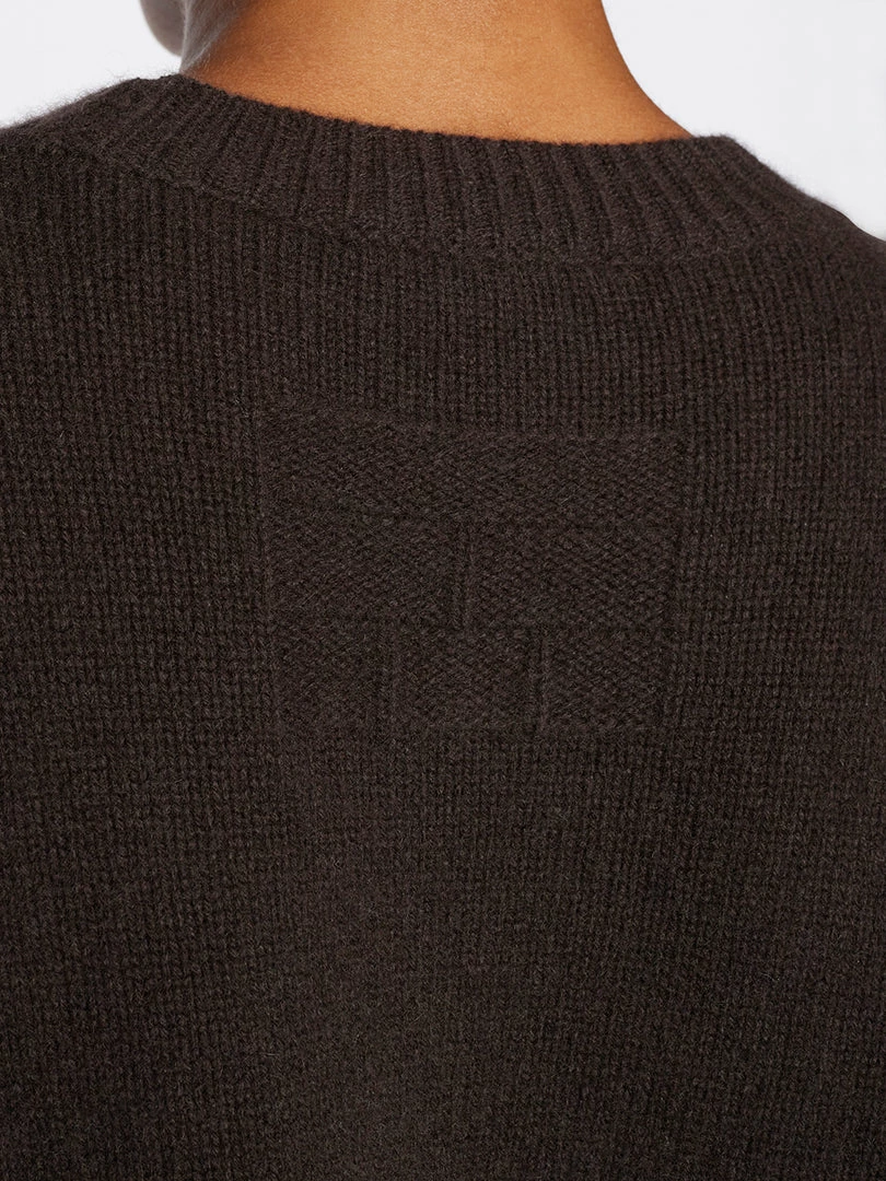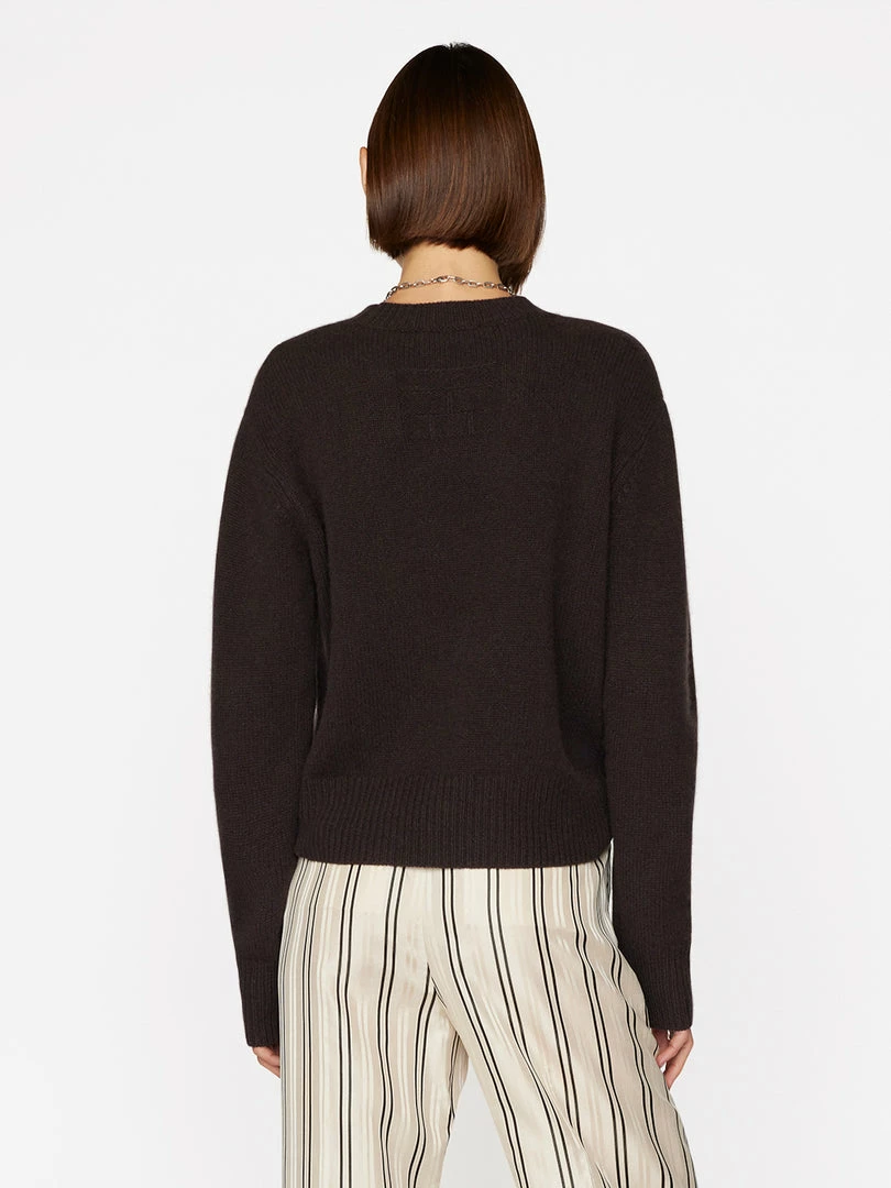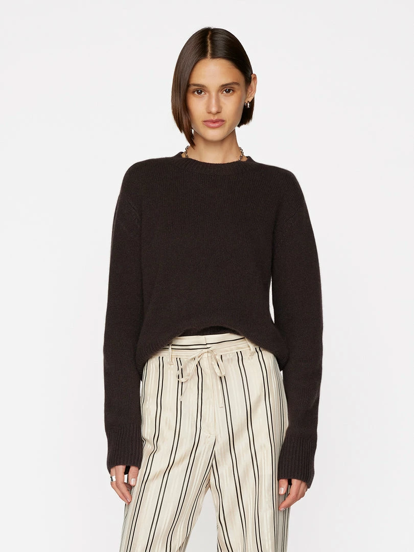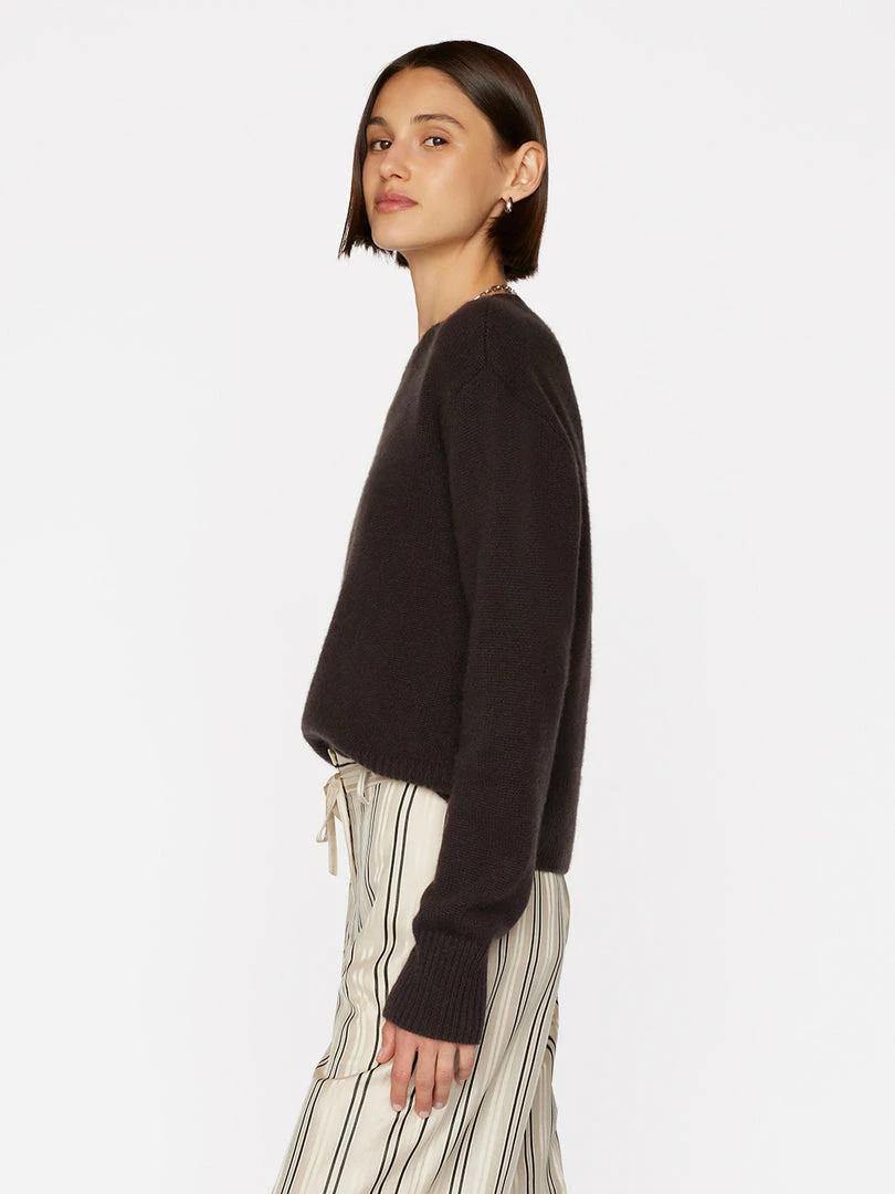 Elevated and timeless, this essential cashmere sweater features a modern fitβslightly cropped hem, boxy silhouetteβthat works with high-waisted denim, leather minis, and joggers on off-duty days. Note the FRAME plaque artfully knit into the back as an extra chic detail.