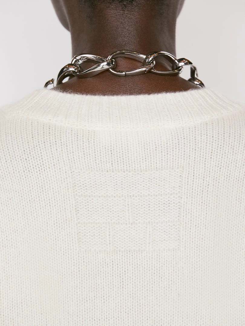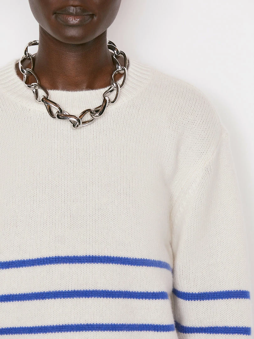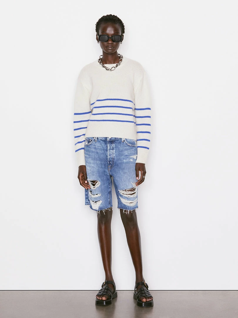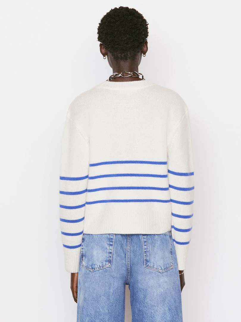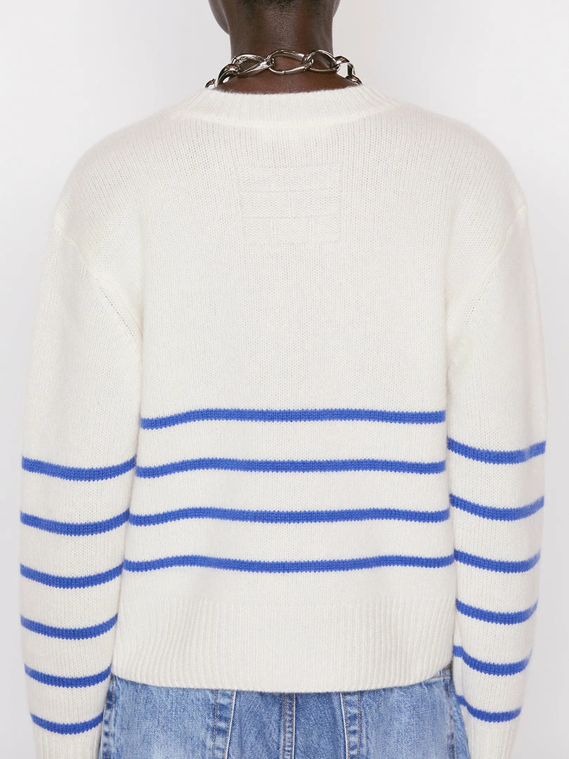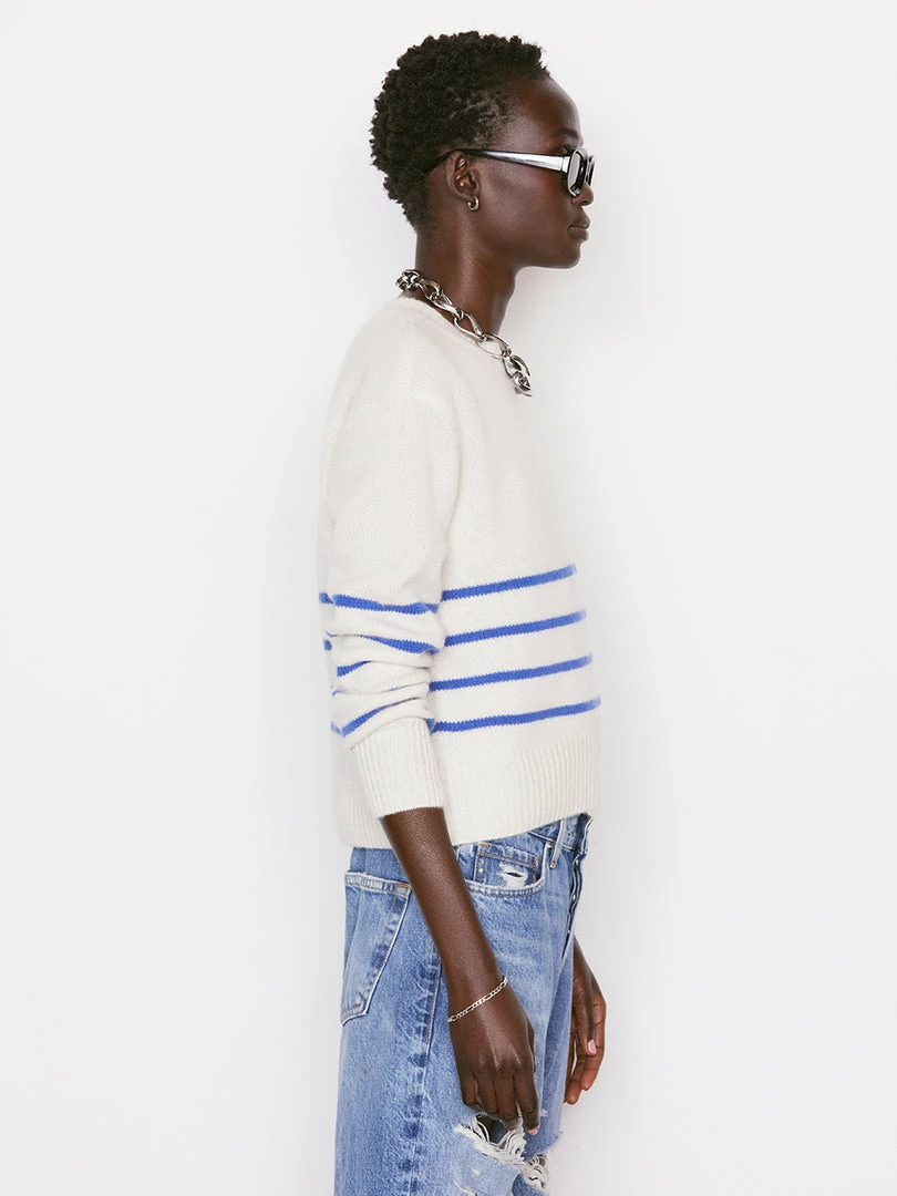 Classic lines and elevated construction, all knit in luxuriously soft 100% traceable sustainable cashmere. This striped crewneck is a summer staple with a modern fitβthe bottom hem is slightly cropped to hit at the natural waistβand features ribbed cuffs and hem, plus the FRAME plaque on the back.