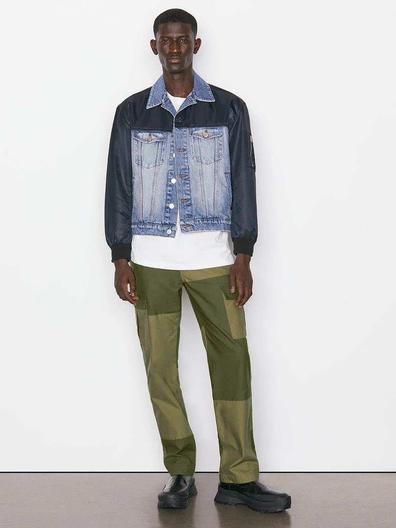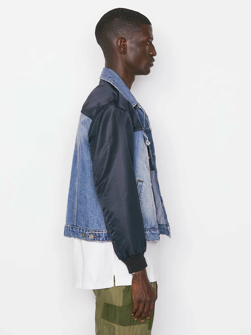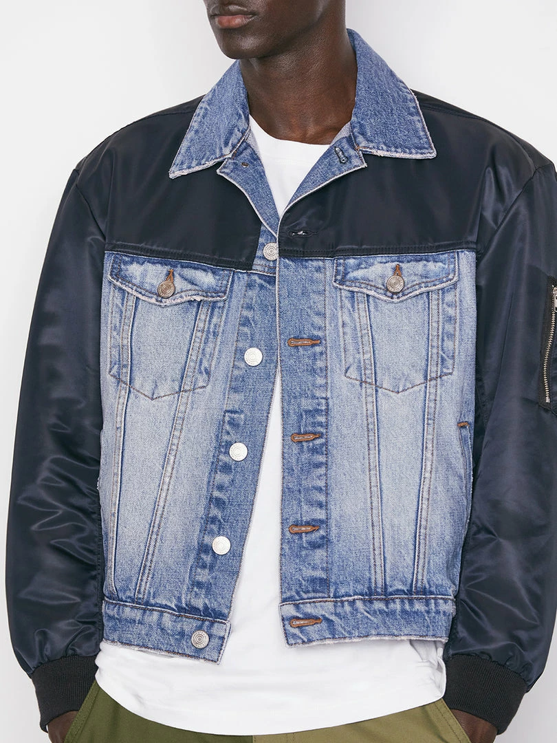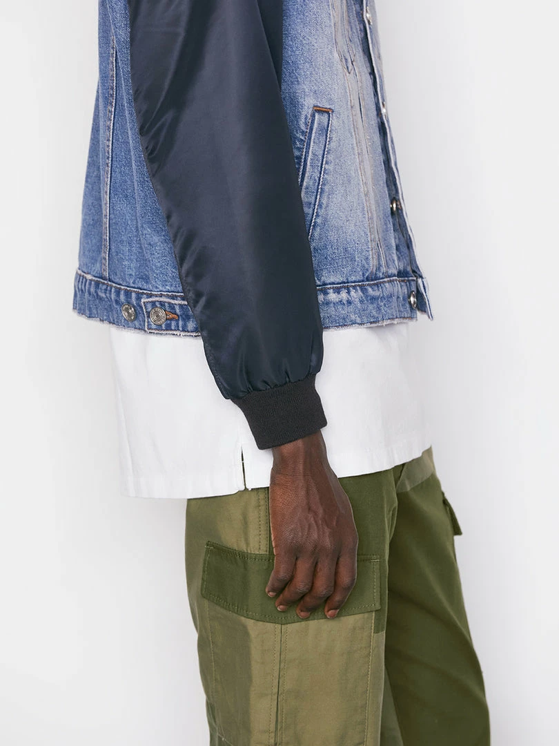 This best-of-both-worlds denim and nylon layer combines classic jean jacket construction with a bomber-style details, like navy nylon sleeves with a zipped pocket and ribbed fabric cuffs. Made to be worn across activities and occasions, and with everything from denim to sweats.