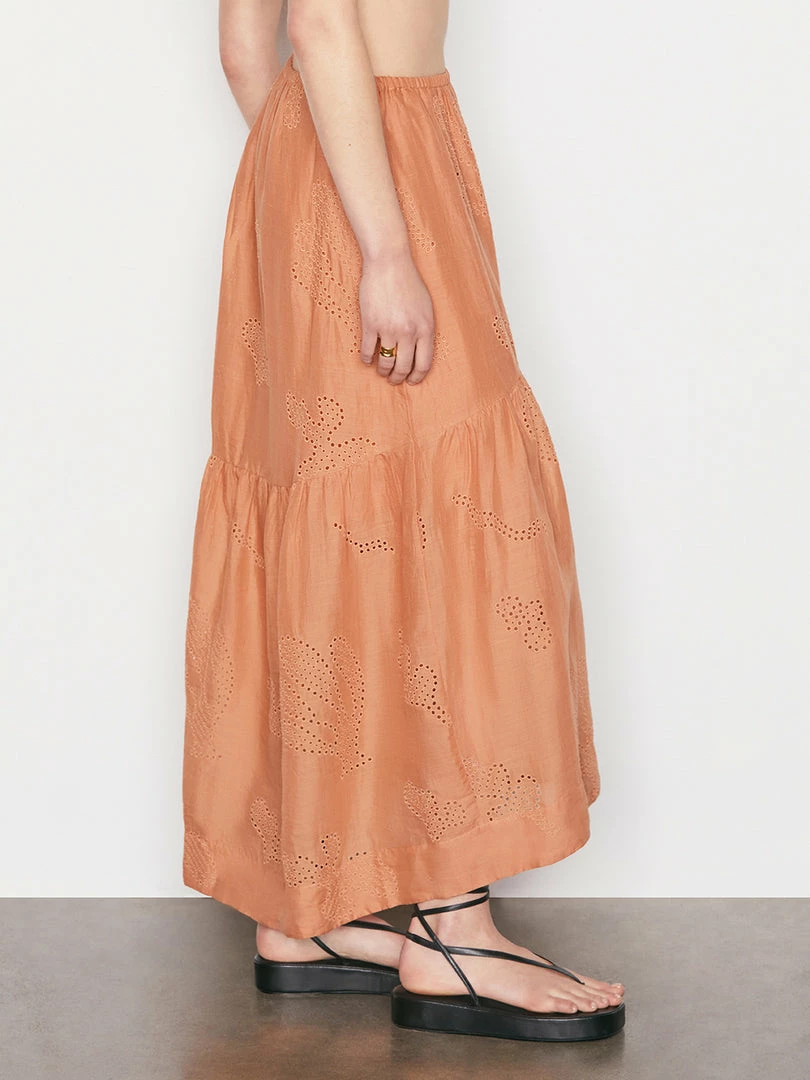 Embroidered with our FRAME-exclusive eyelet from elasticized waist to high-low hem, this gauzy maxi skirt breathes south of France vibes into every subway ride. Fully lined for easy styling, with tiered shirred seams for extra volume. Pair with the matching top for an event-ready look.