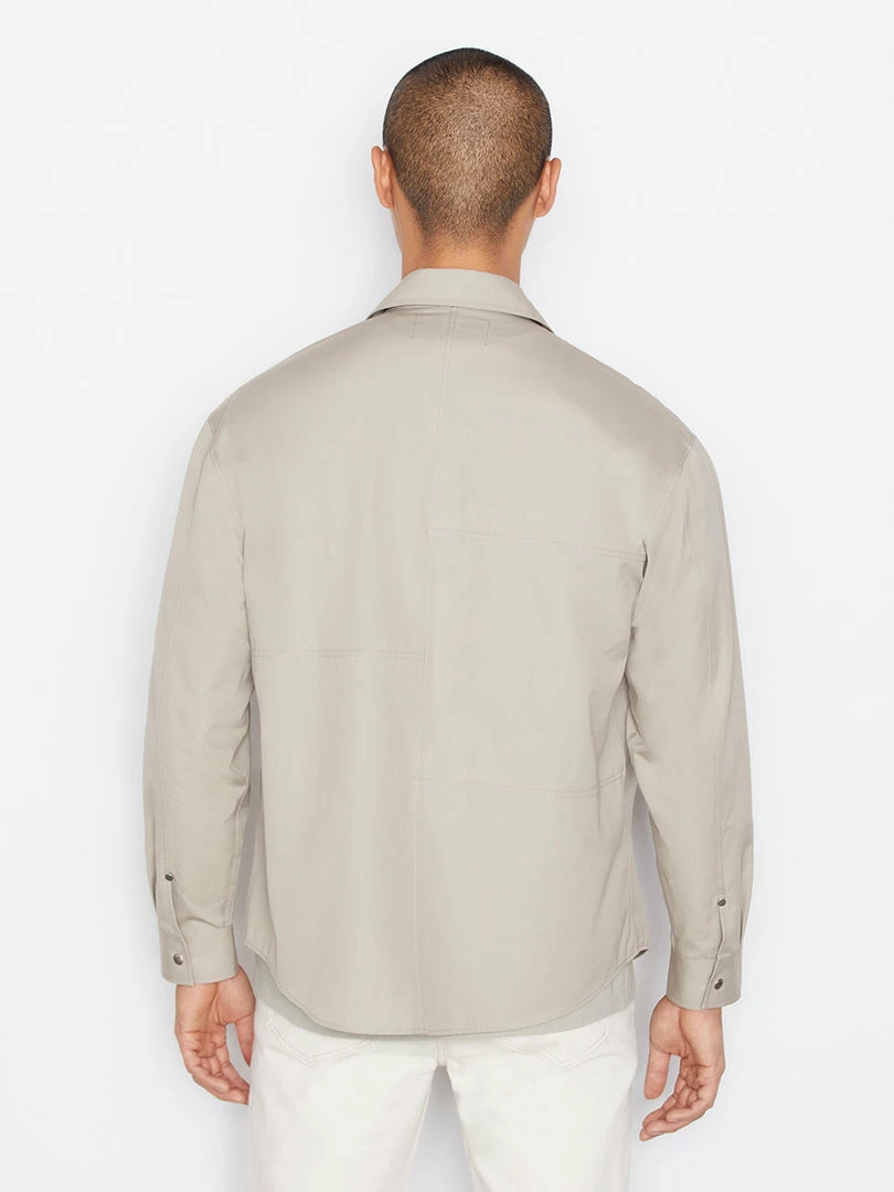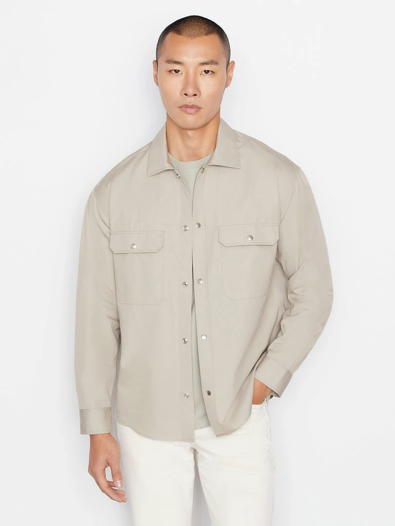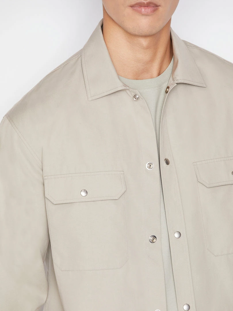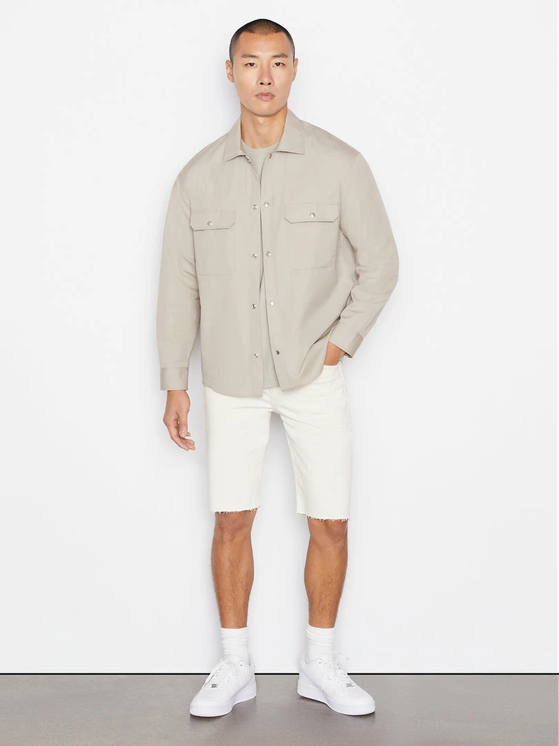 Woven from 100% cotton in Canvas Beige, this classic button down doubles as an overshirt layer in warmer weather. A slightly dropped shoulder, two front pockets, and the signature FRAME plaque subtly seamed on the back make this a style-forward all-season closet staple.