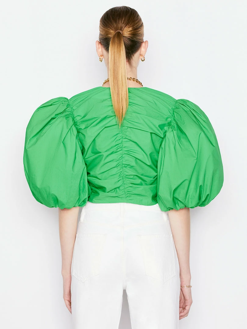 Shirred cotton enhances this expertly crafted top, lending added texture to an already eye-catching cropped silhouette. Gathered seams create voluminous puff sleeves, and meet a button-down placket for an overall feminine look. Pair this blouse with vintage-blue wash denim, or create a monochrome moment with Grass Green denim.