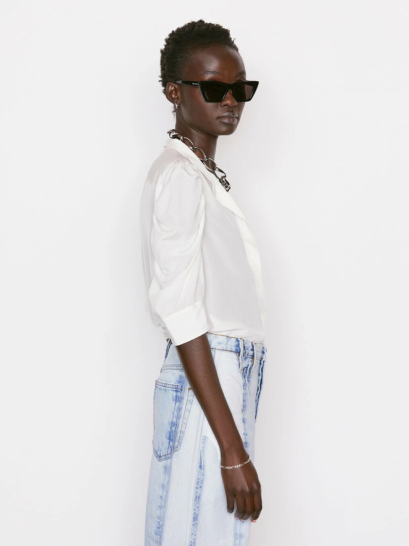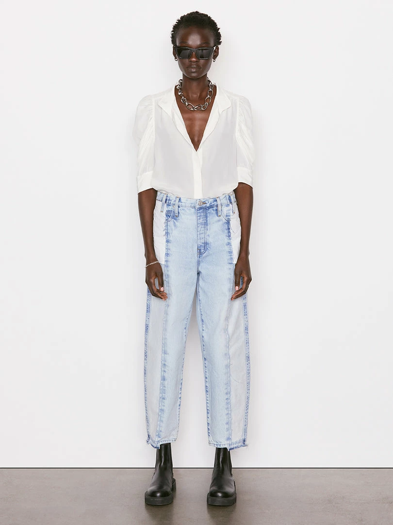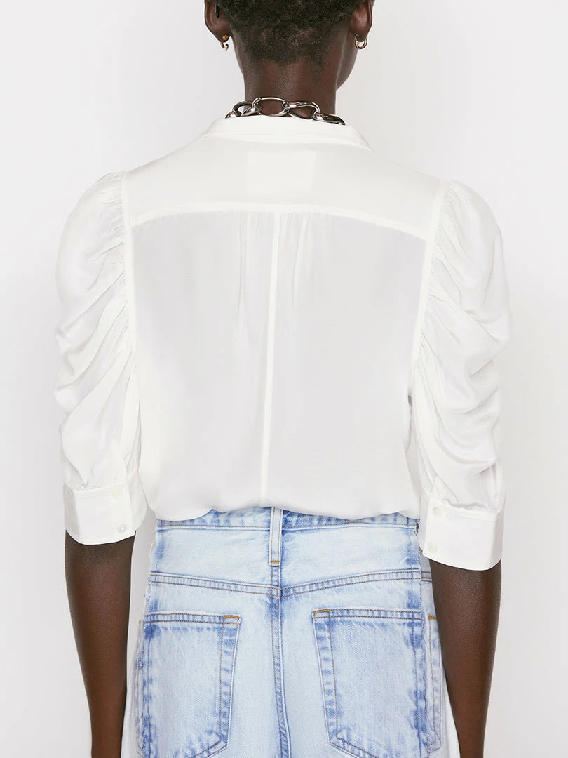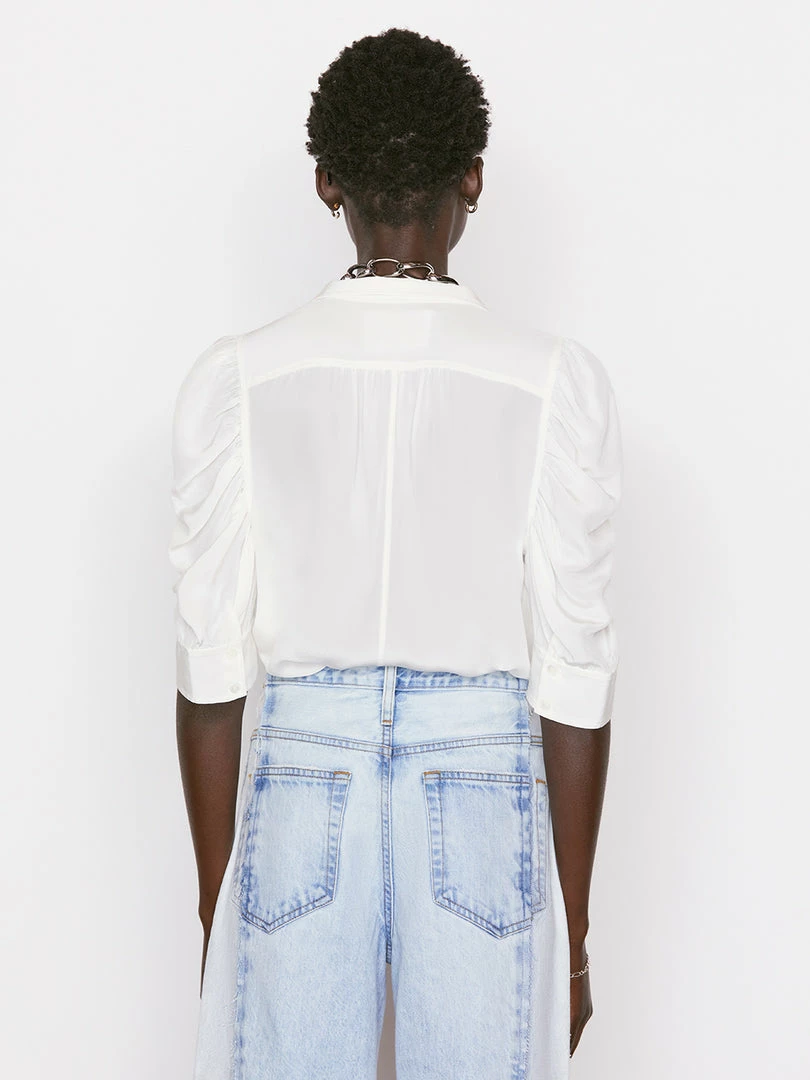 This delicate ramie blouse epitomizes modern femininity, featuring a high neckline and boldly puffed sleeves with ruched detailing. We love it tucked into cropped wide jeans with leather slides and a slim belt.