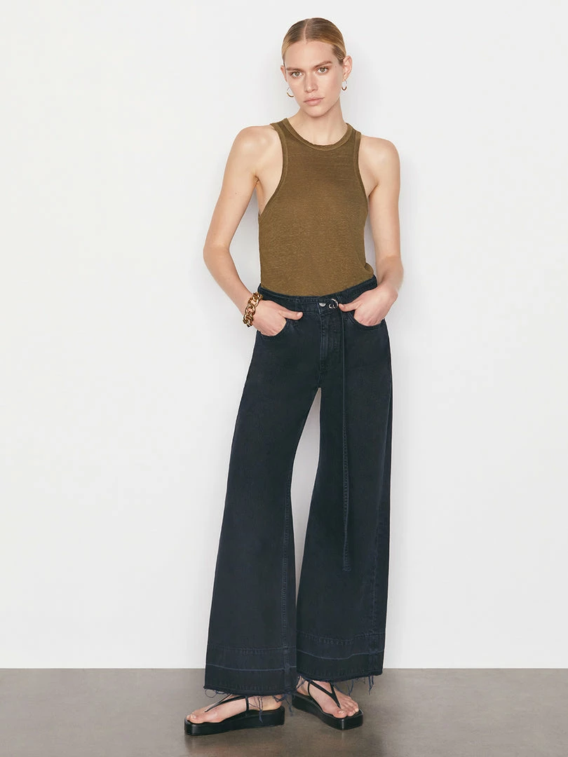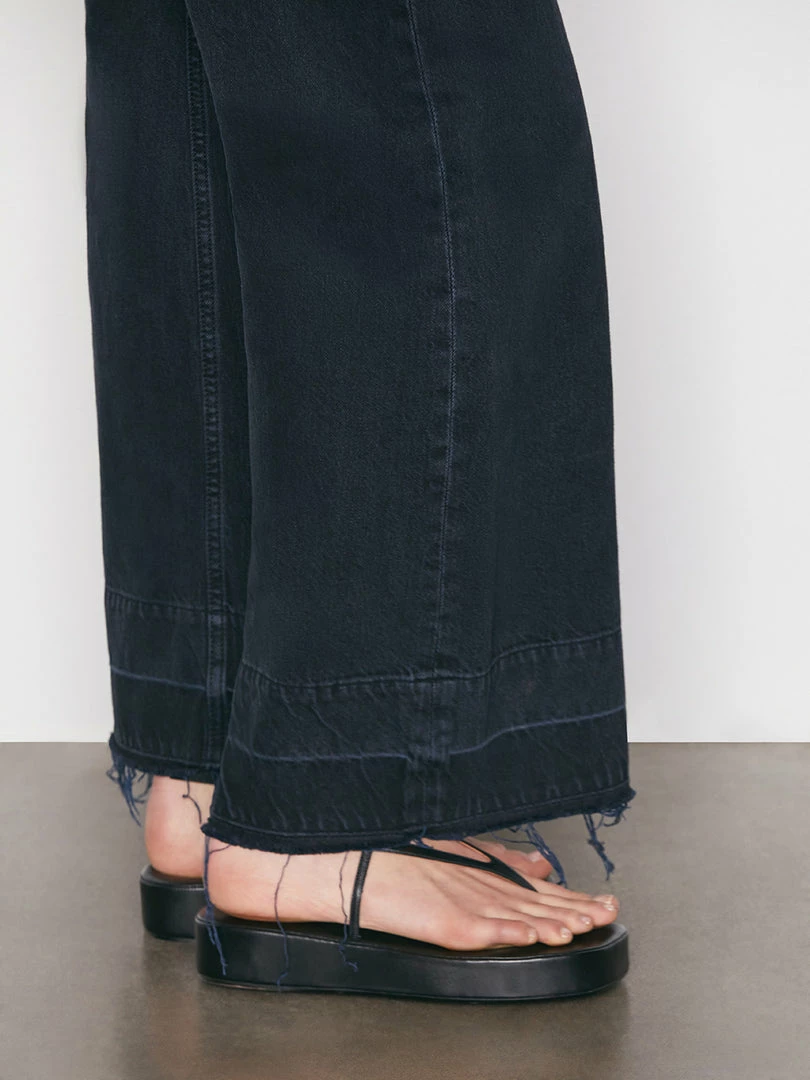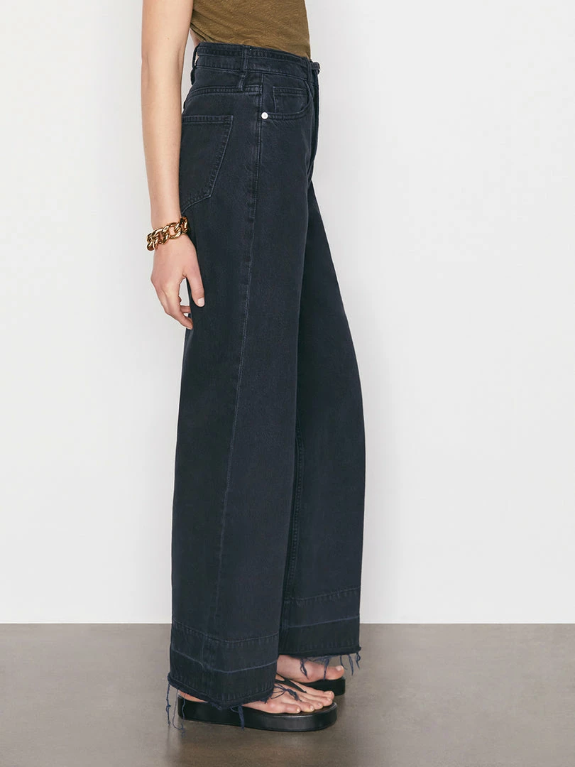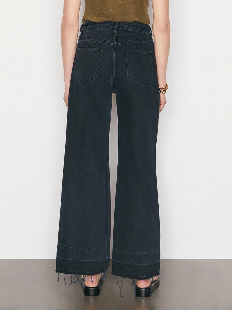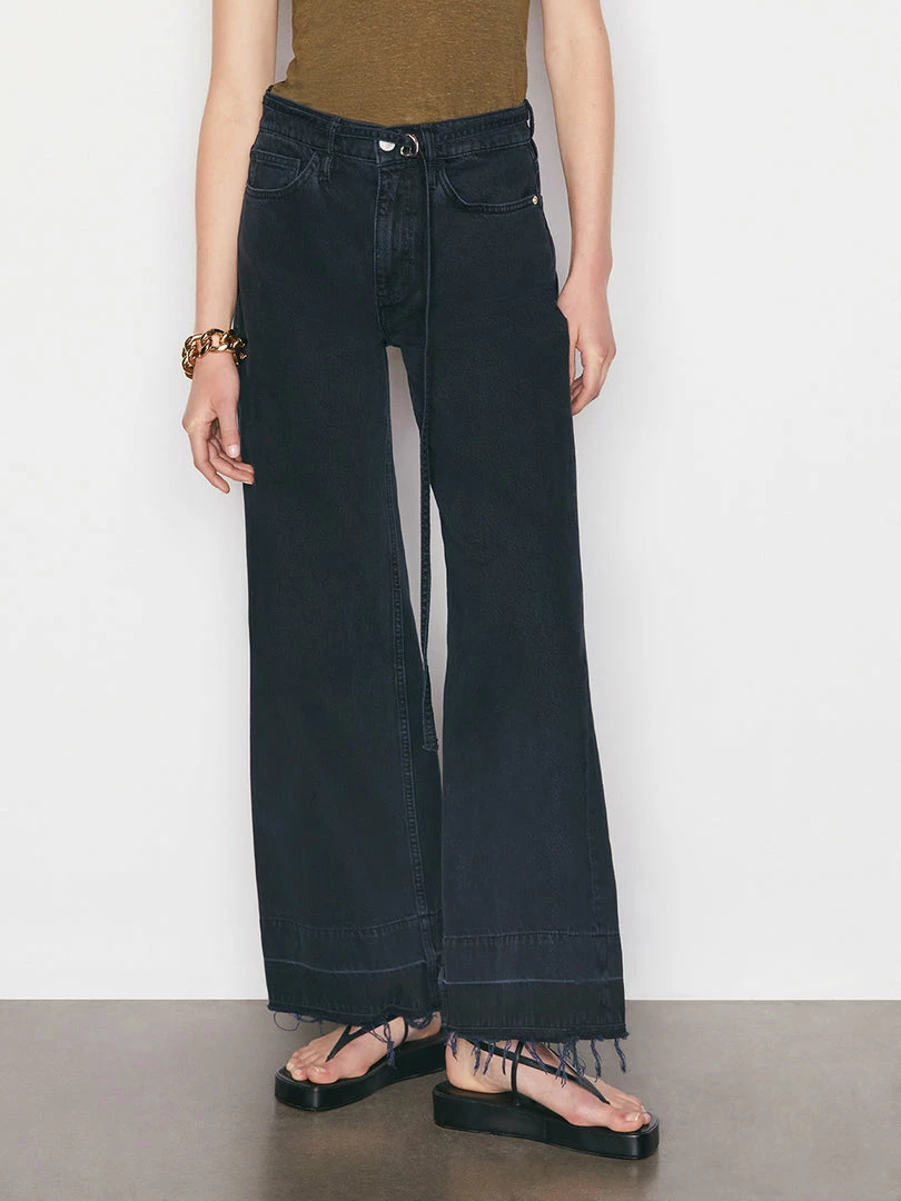 High-rise with a roomy full-length wide leg and slim, β90s-inspired matching belt, this jean features a vintage-black wash and raw hem. Expertly crafted from premium rigid denim made in Italy, for a flattering fit that pairs perfectly with cropped tees and crochet bodysuits.