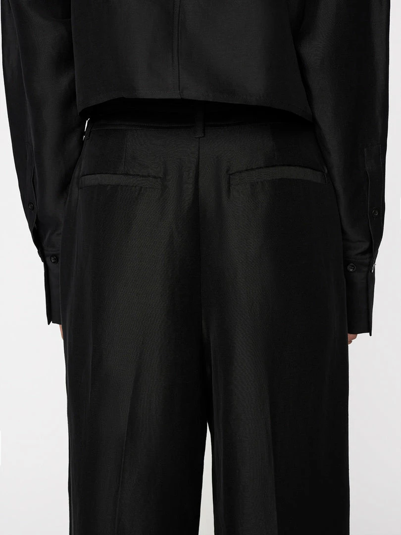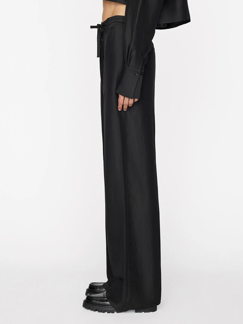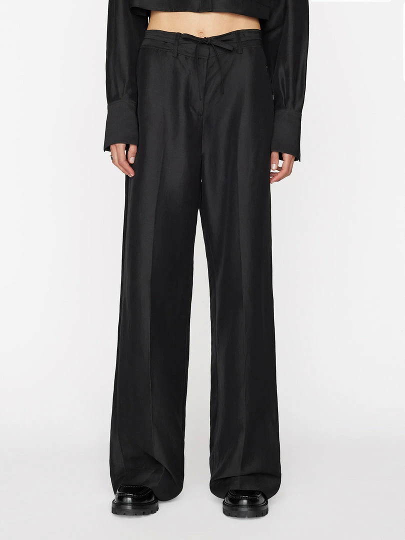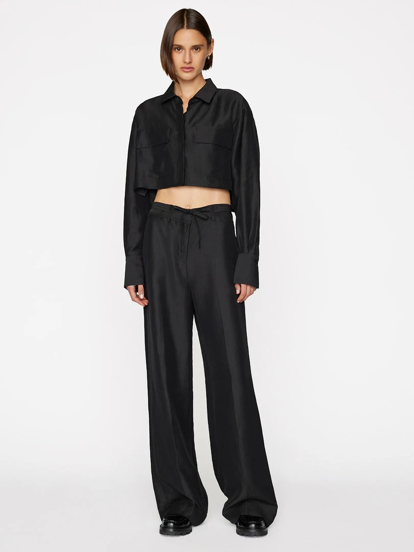 Utilitarian style that swings ultra chic. With a high-rise waist and a full-length leg that drapes beautifully at the ankle, this safari pant features a slight sheen and a tie-waist belt, for a elevated take on ease—particularly when paired with the matching cropped safari shirt.