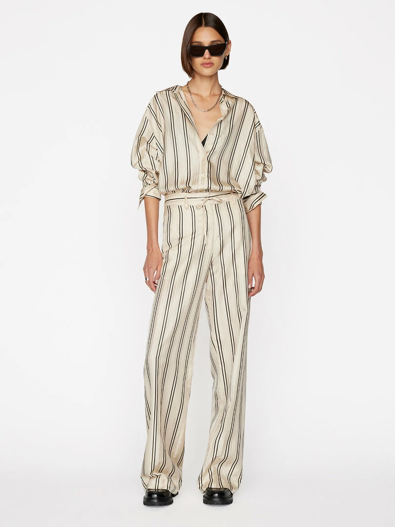 Utilitarian style that swings ultra chic. With a high-rise waist and a full-length leg that drapes beautifully at the ankle, this silk jacquard safari pant features a slight sheen and a tie-waist belt, for a elevated take on ease—particularly when paired with the matching oversized shirt.