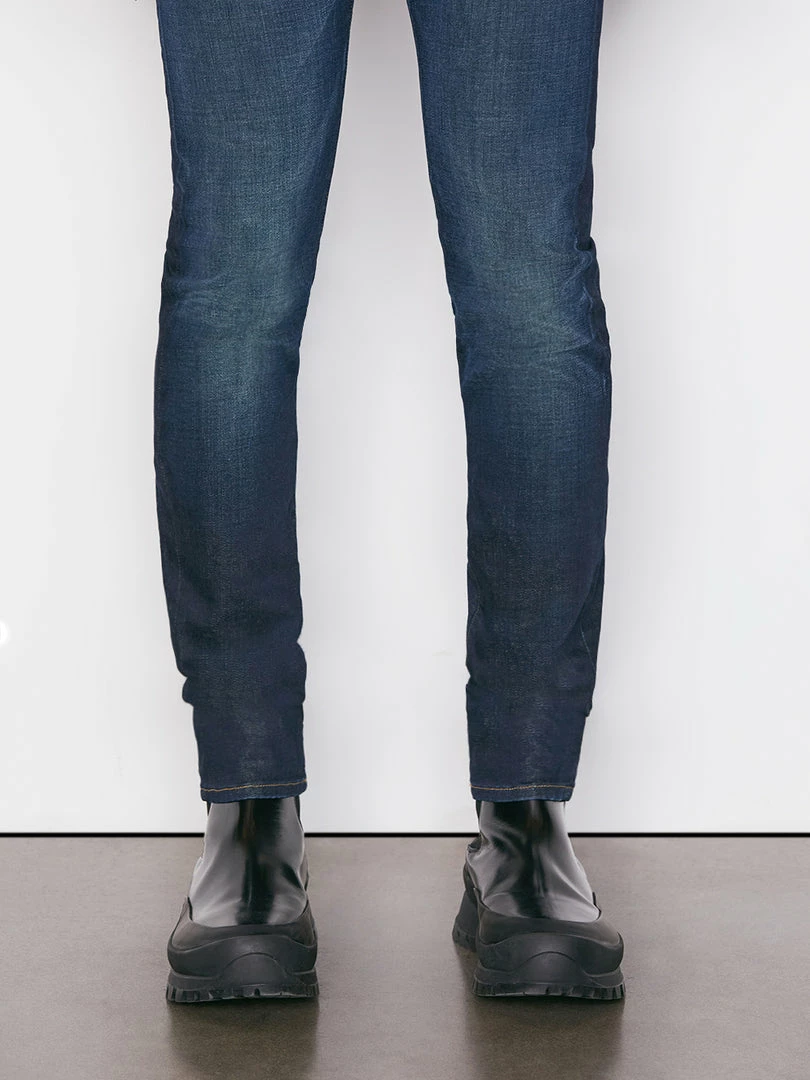 A Skinny Silhouette Cut From Premium Denim In A Dark Blue Wash, With Whiskering. Classic 5-Pocket Construction, Narrow Fit Through The Hip With A Slim Leg Finish.