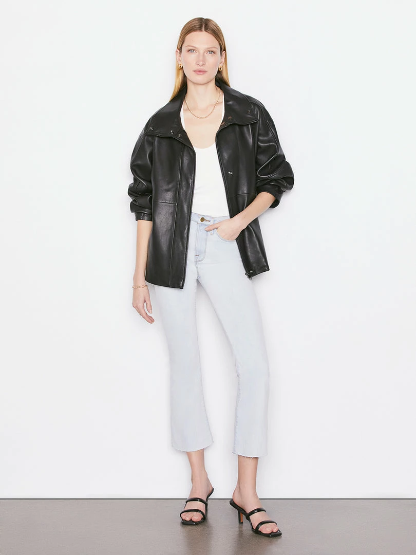 Our best-selling cropped boot-cut silhouette featuring a vintage-inspired light-indigo wash and a raw hem for an undone feel. Crafted from stretch denim and designed with a comfortable contour waistband thatβs form-fitting at the top and tapers out from the knee, style yours with an oversize blazer, voluminous blouse, or mariner stripe.