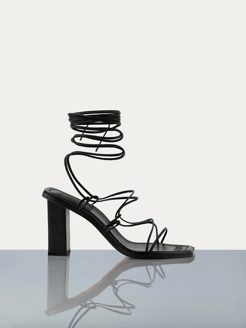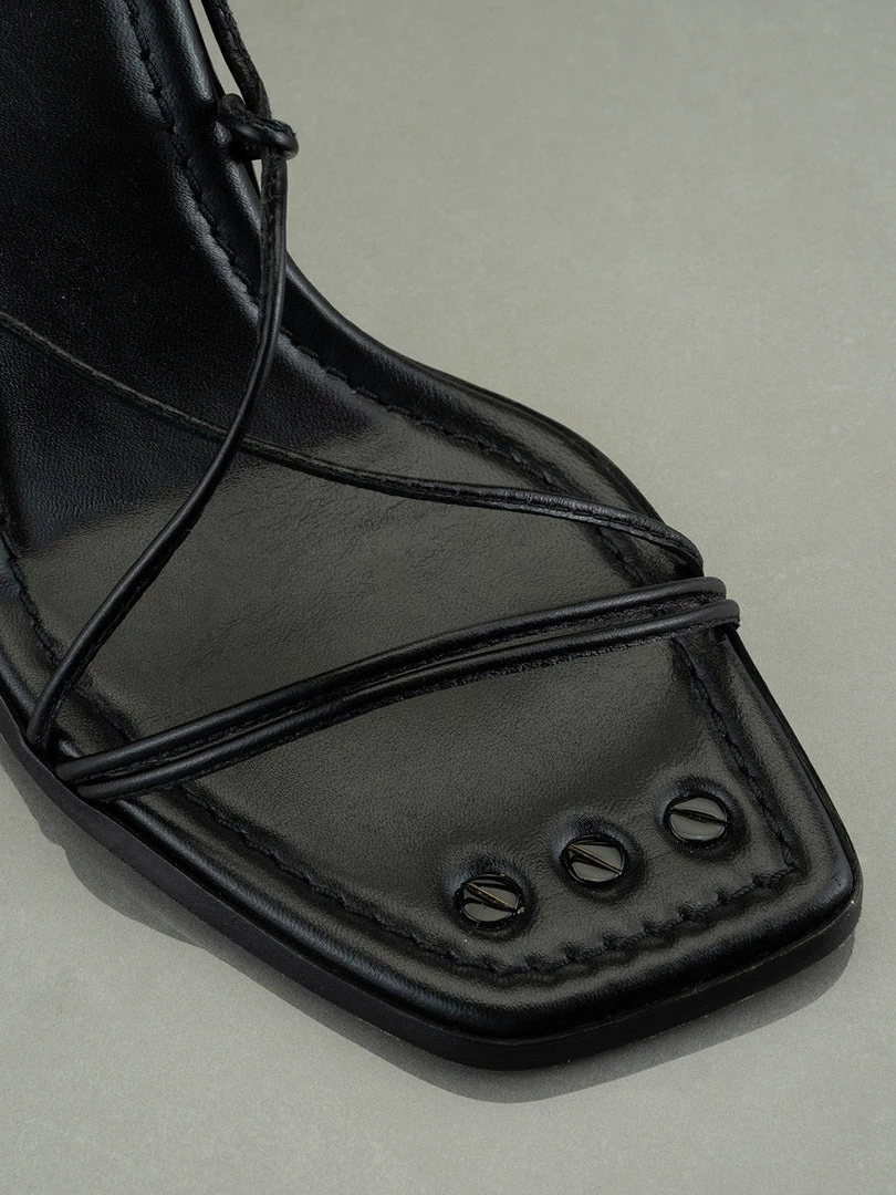 The ultimate barely-there sandal with a bohemian spirit, this lace-up silhouette features a stacked heel and squared toe with hand-screwed accents and contrast stitching. Crafted from supple Italian leather, dress it up or down any day of the week with denim, dresses, suiting, and beyond.