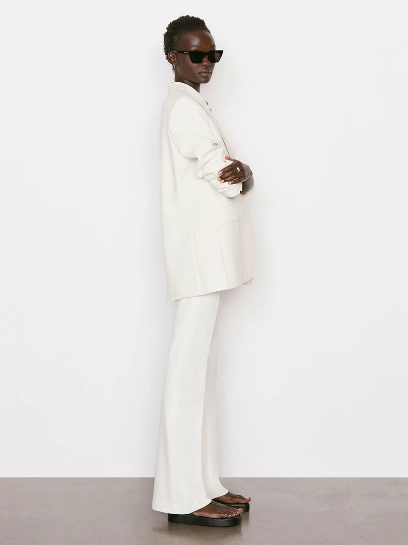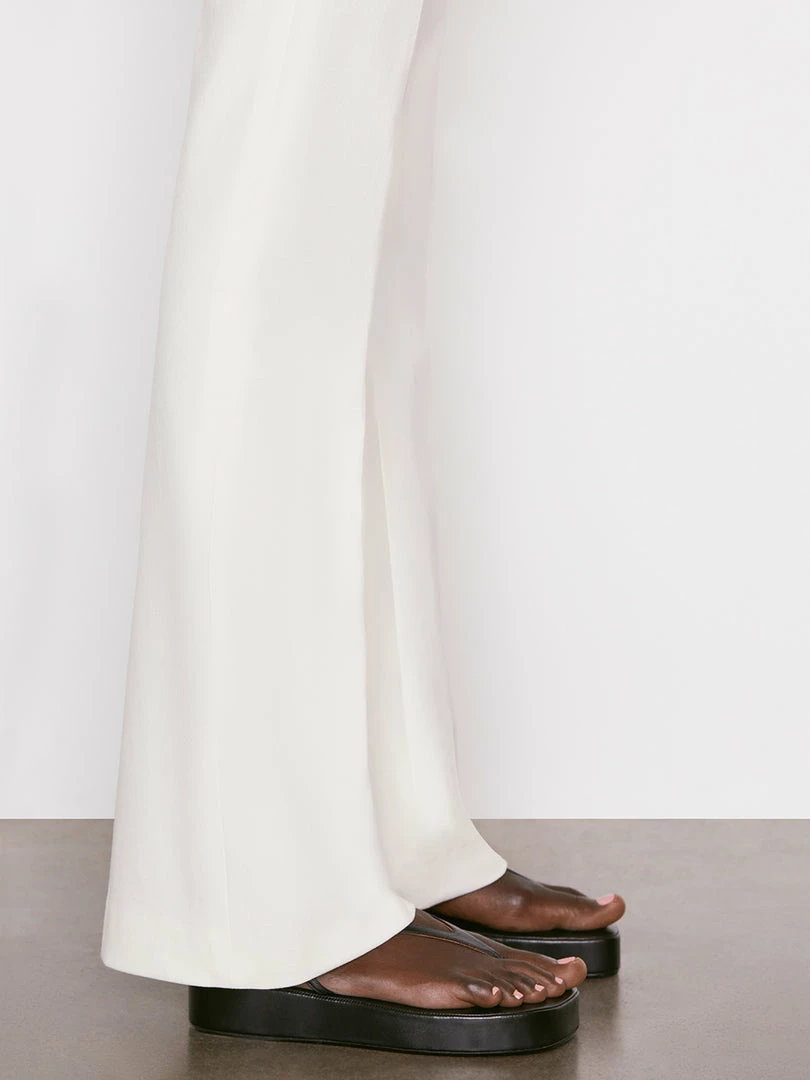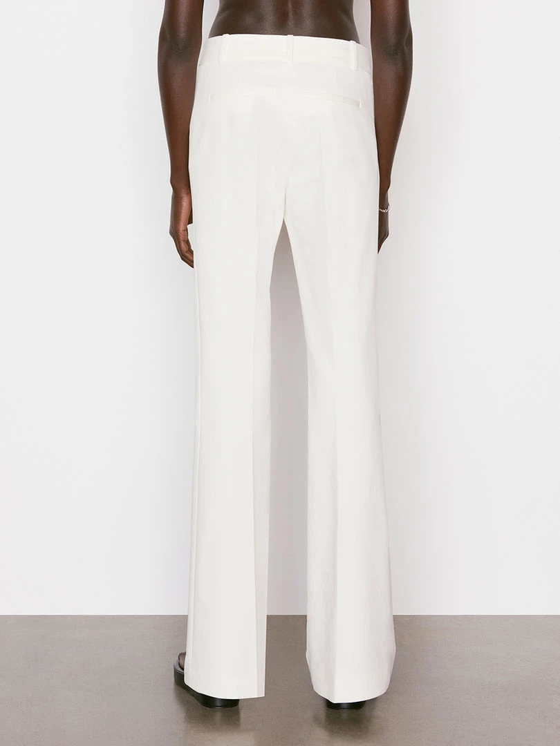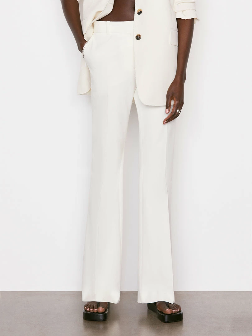 Our best-selling Le High Flare silhouette, reimagined in a bi-stretch trouser style made with sustainable materials. The high-rise fit puts a fresh spin on retro style that hugs the hips and thighs and finishes with an easy flare from the knees. Contrast the Blanc hue with Breton stripes and refreshingly bright accessories.