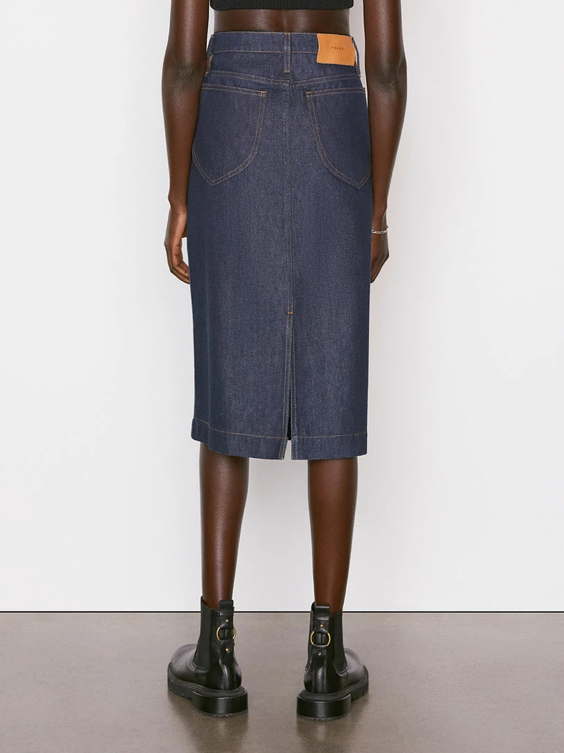 A new fit in our Le Italien collection, this midi skirt is made on a family-run nature preserve in Italy that operates with the highest ethical standards. Designed to hit just below the knee, this 100% cotton piece is made from biodegradable denim, and features signature Le Italien gold hardware and trim.