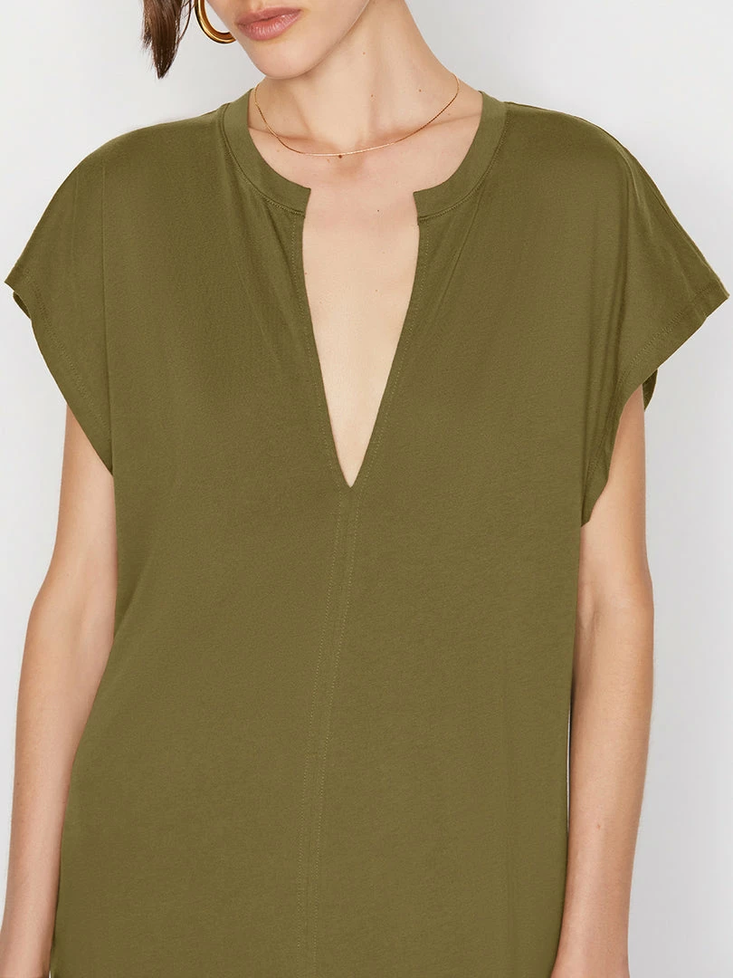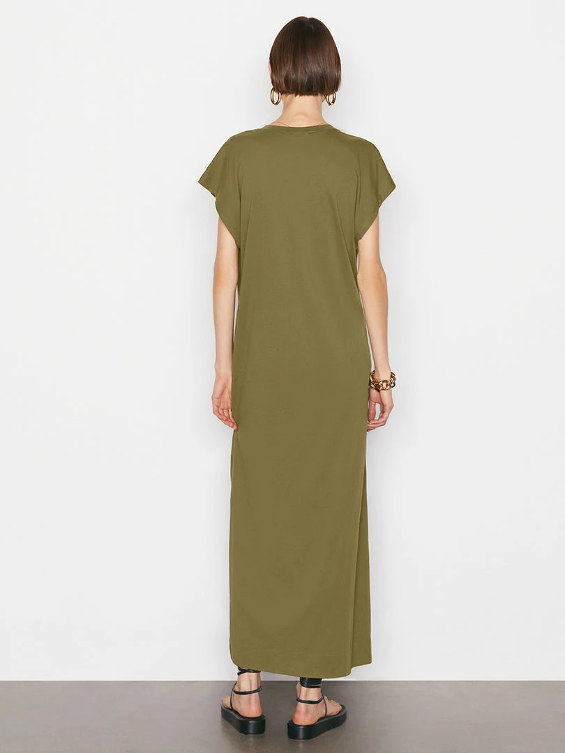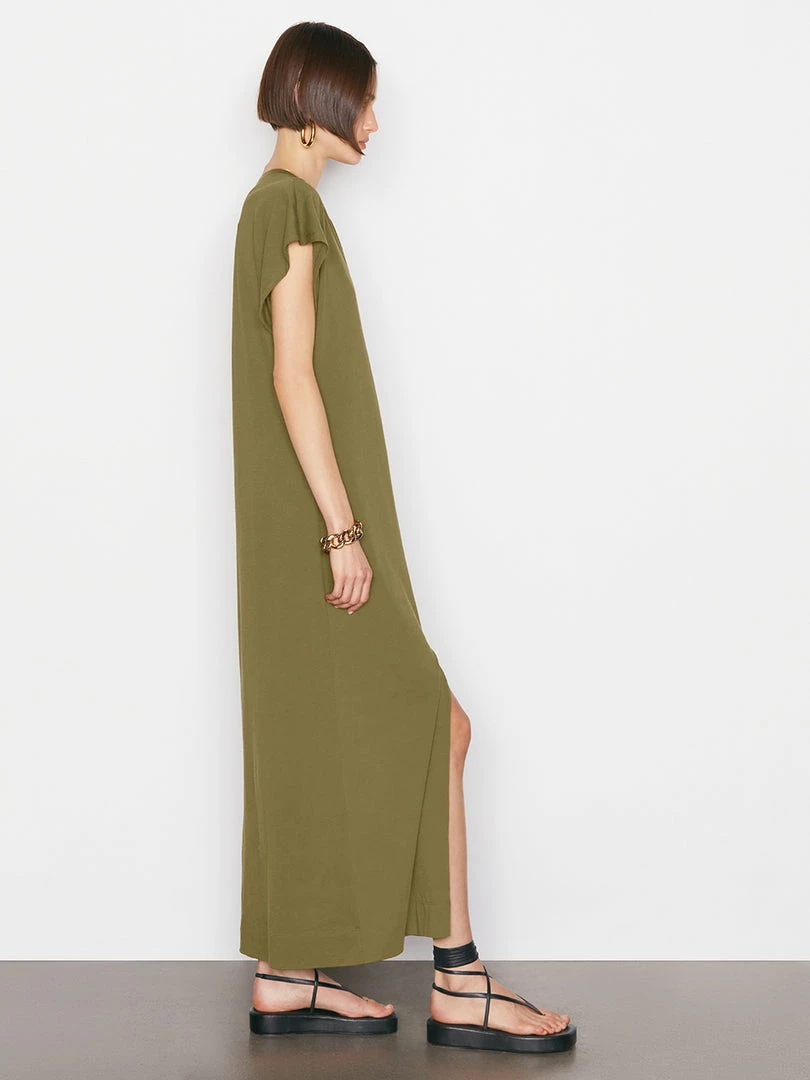 The menswear-inspired tee, made into a one-and-done outfit for day or night. Crafted from soft, 100% organic pima cotton, with a front slit and a raw cut at the neckline, this maxidress is chic enough for the office, but laid-back enough for poolside lounging.