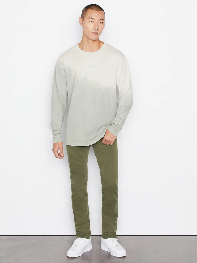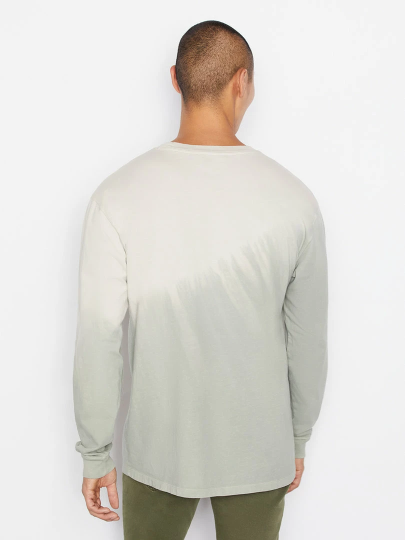 Our long sleeve shirt got the tie-dye treatment. A beige and sage gradient with natural ebbs, flows, and irregularities is the backdrop for the white FRAME logo across the front. Try yours with destructed denim cutoffs one day and ecru denim the next.