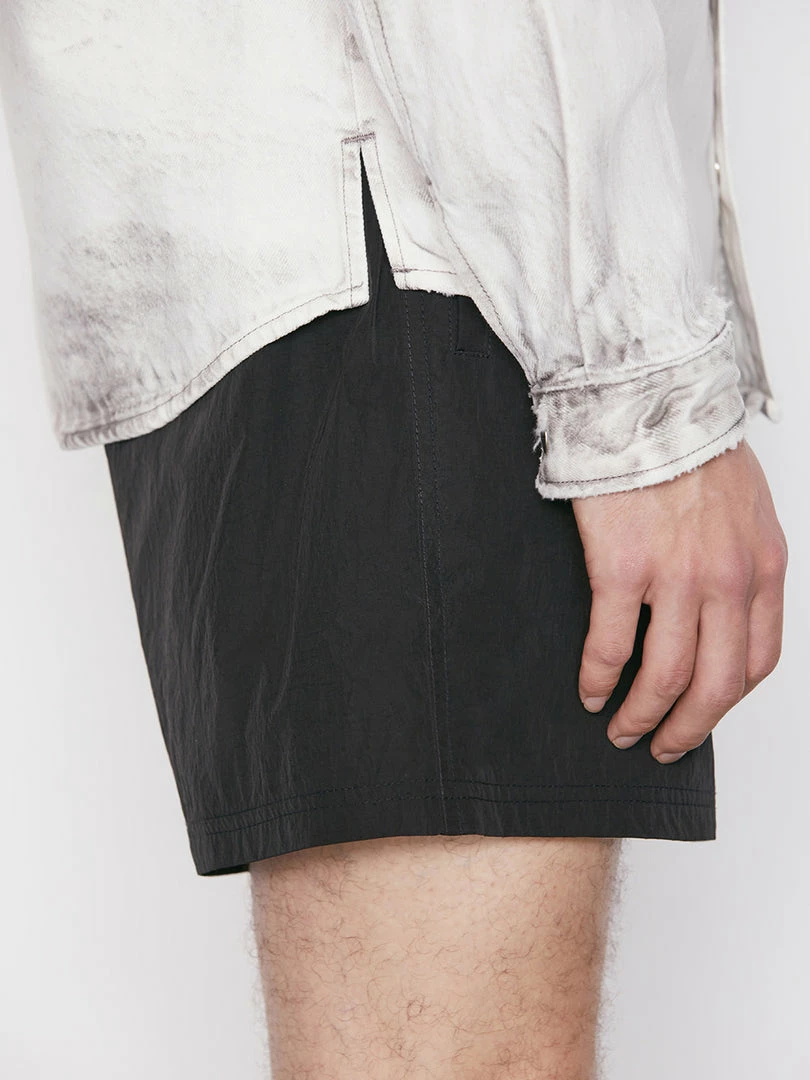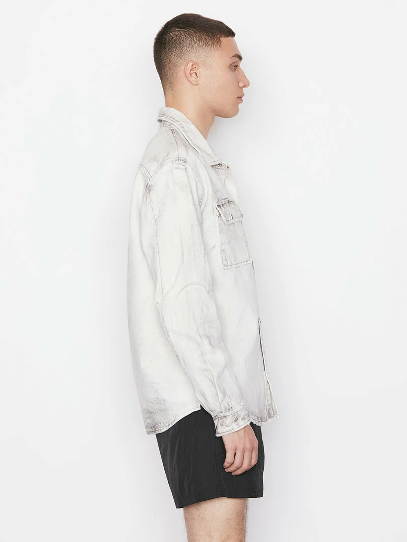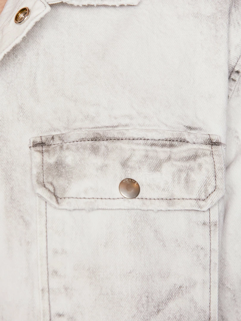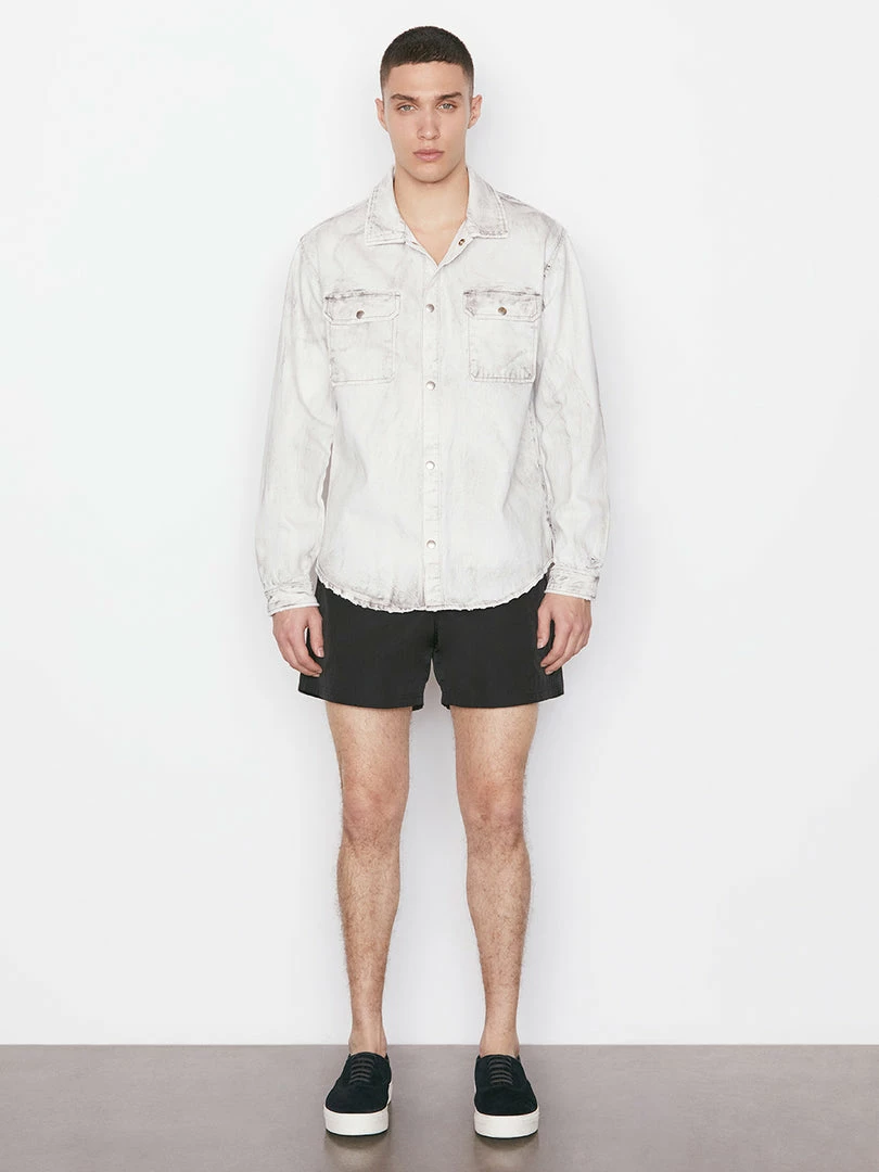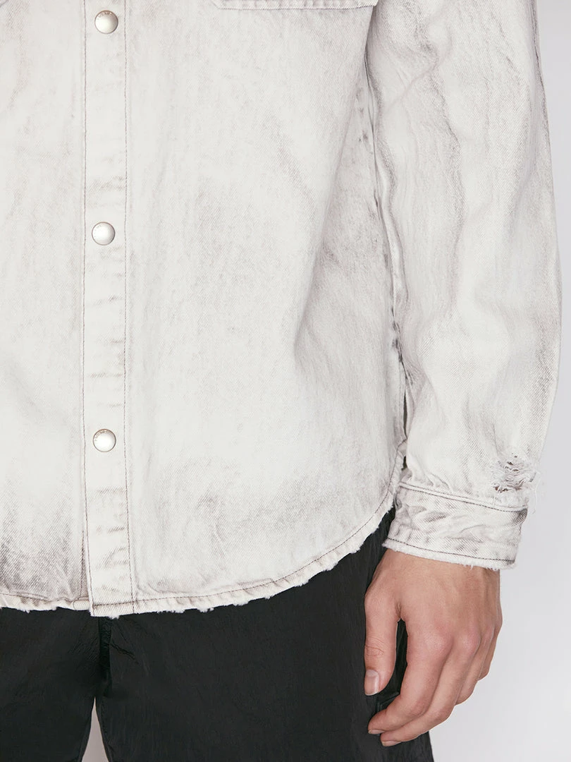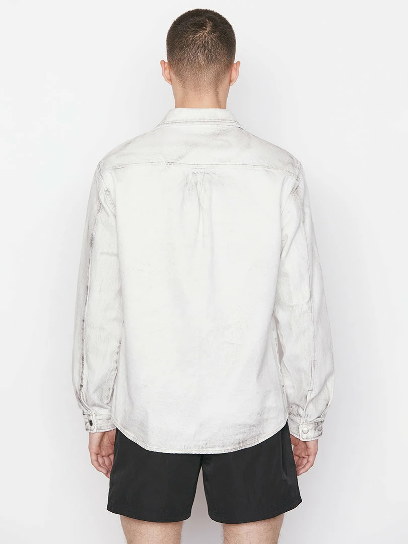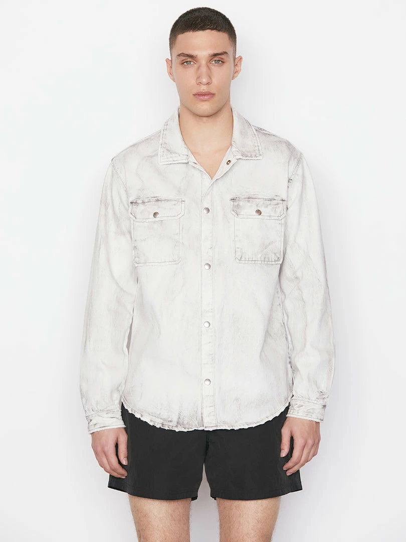 This double pocket denim shirt features a classic collar and cuffs, then dials up the aesthetic with a sunbleached look that features unique natural patterns and fading throughout. Brushed metal buttons complement the grayscale colorway for a lived-in look with a little extra polish.