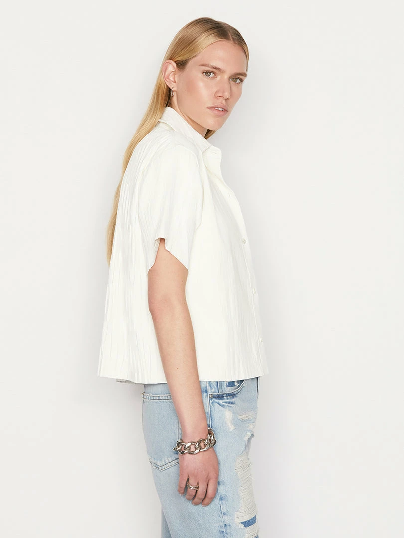 Summer leather hits differentβthis cropped button-down in Bone is crafted from 100% lambskin leather finished with a subtle crinkle effect for singular style. Wear it the way you would any button-down, or create a standout set with the matching short.