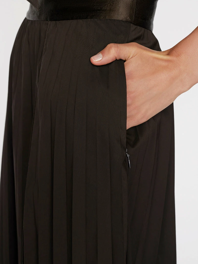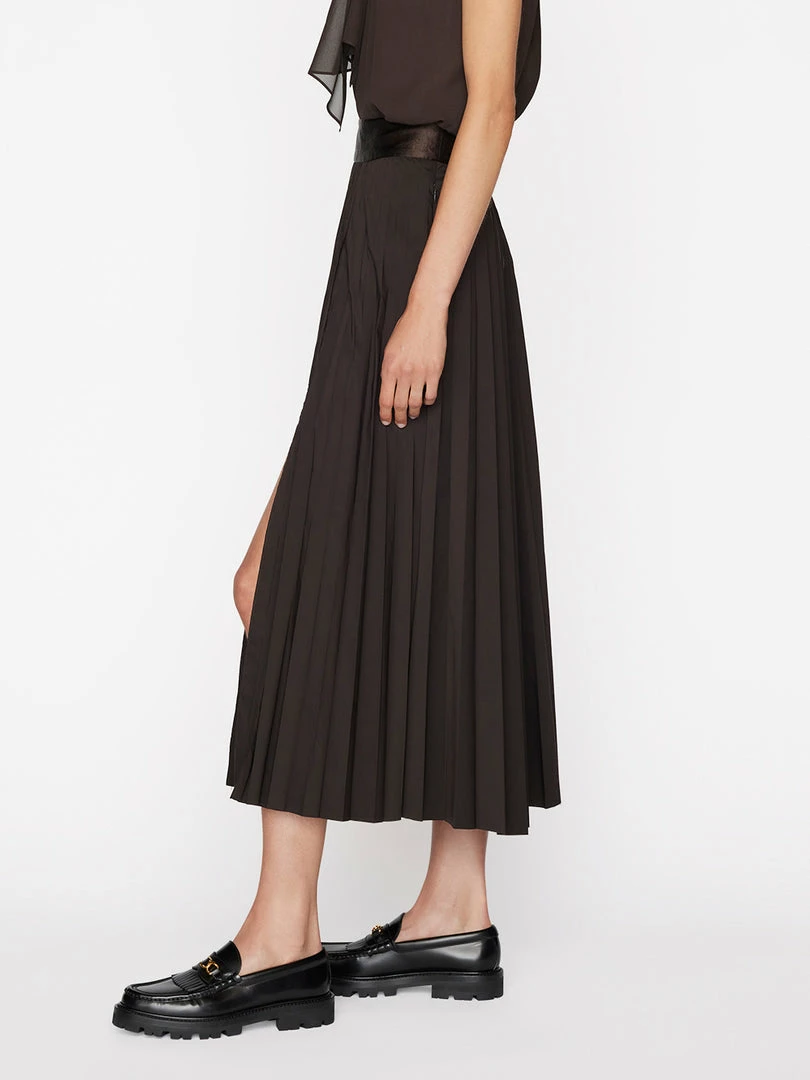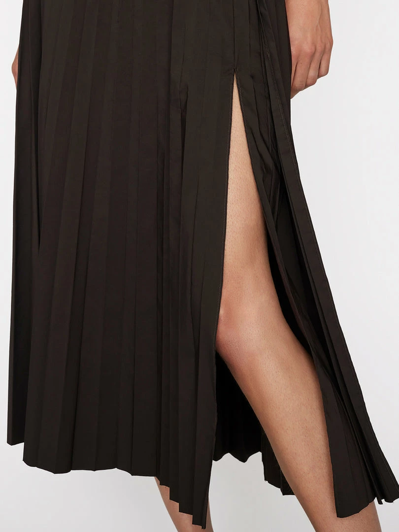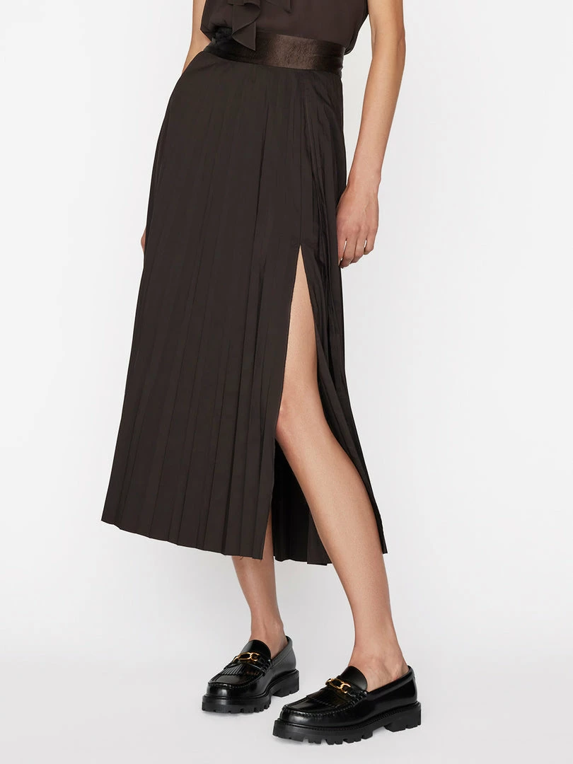 Our pleated midi skirt comes with a built-in pro tip: The crisp cotton high-rise waist closes with an invisible back zipper, for the look of a wrap skirt without the fuss.