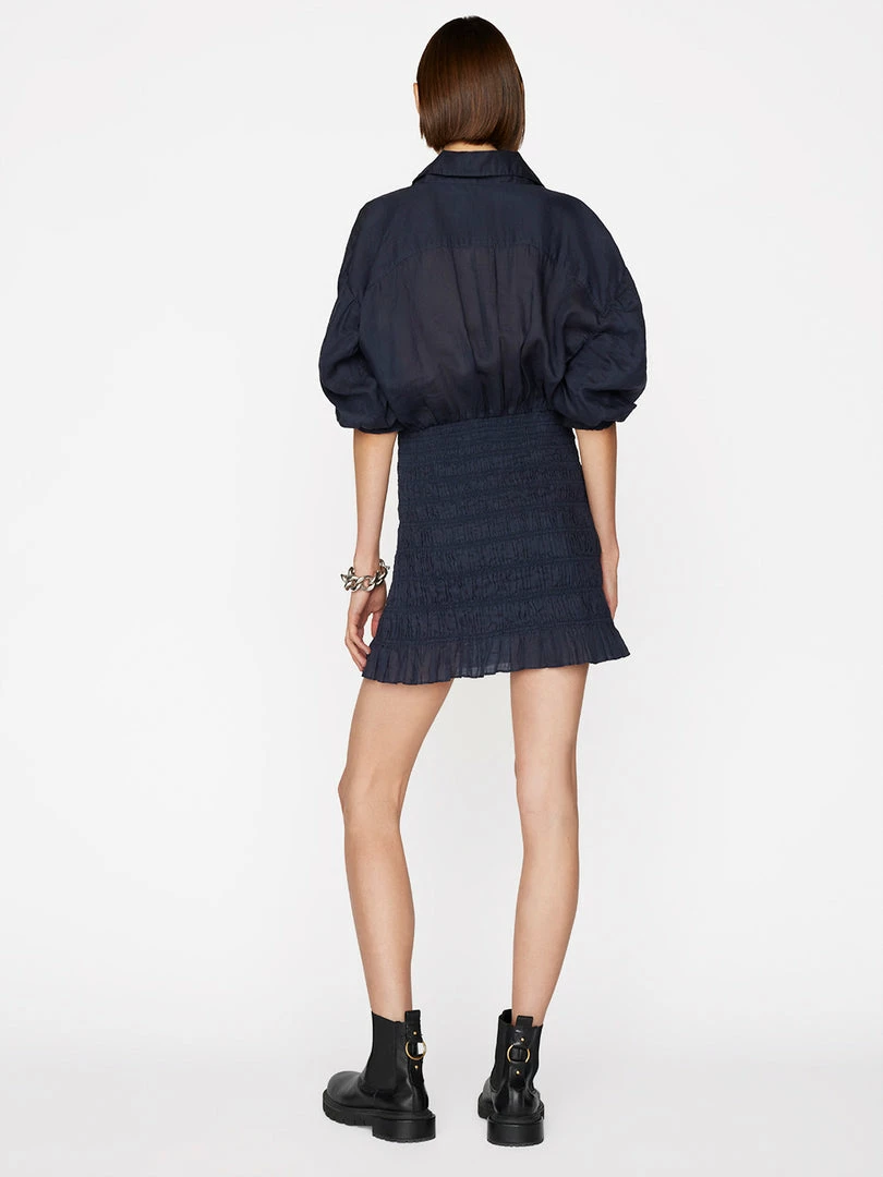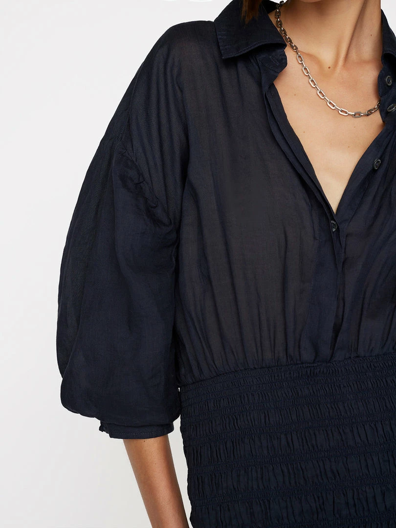 In lightweight, smocked ramie, this puff-sleeve shirtdress breathes feminine allure into your warm-weather uniform, and looks equally as chic in cooler seasons with boots and a cardi. The skirt is lined and hits at the natural waist, and the shirt-style buttons can be done up or left open to reveal a cami, bra, or bikini top.
