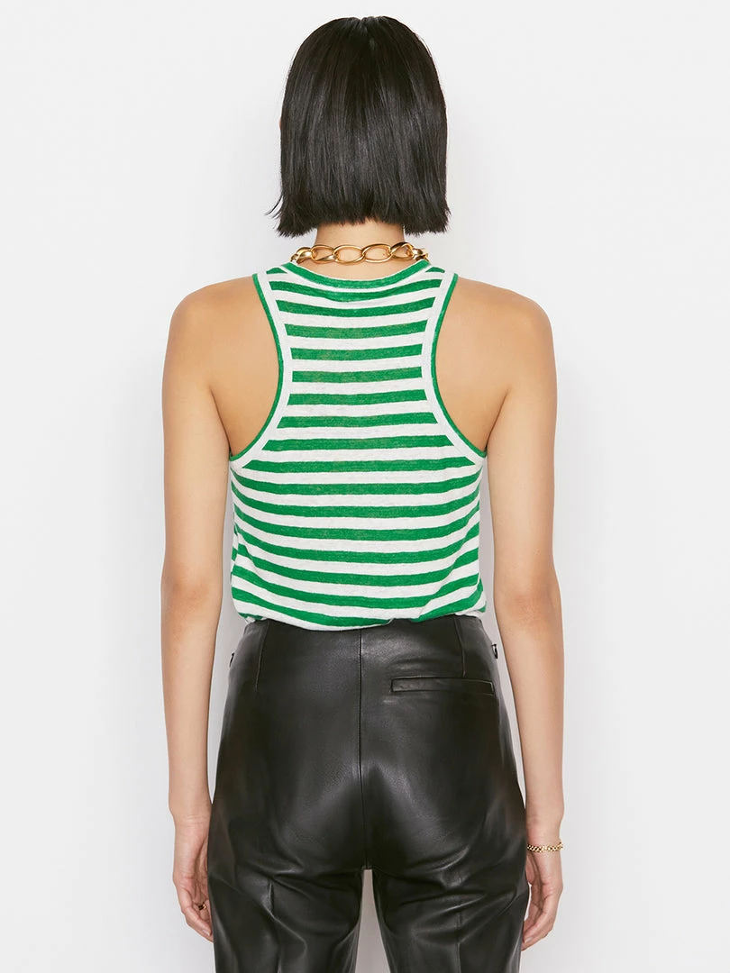 This essential Ringer Tank is crafted from organic linen and features exaggerated Y2K-inspired armholes and racerback styling. With a body-skimming fit and Court Green Breton stripes, this tank pairs with denim shorts in the summer and as a layering staple year round.
