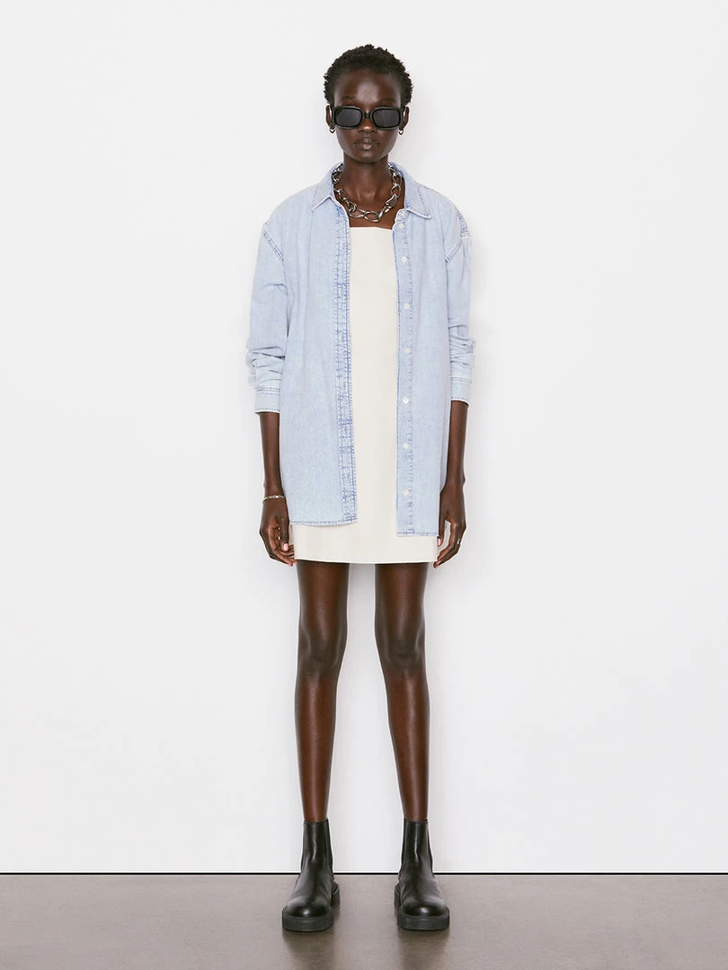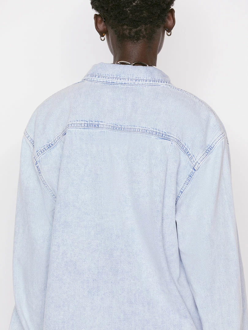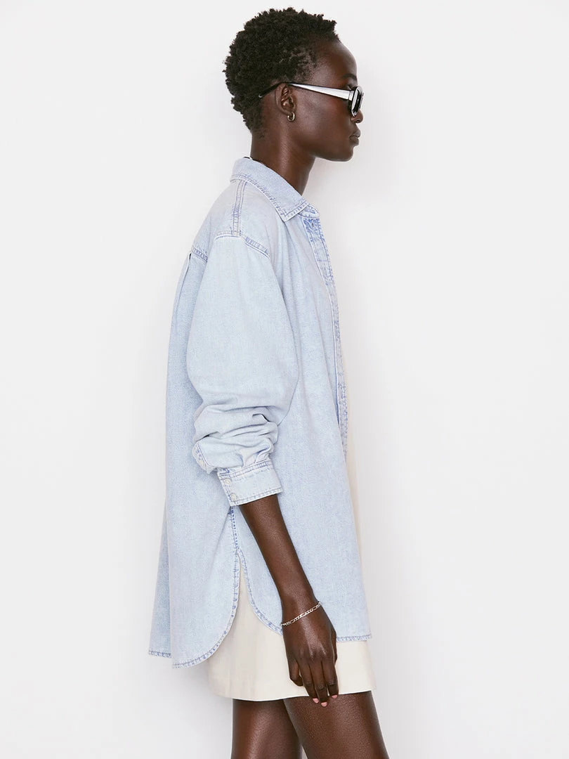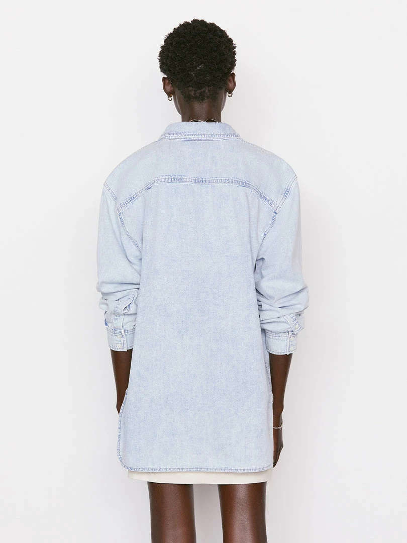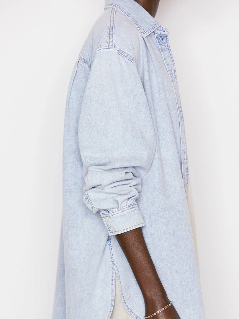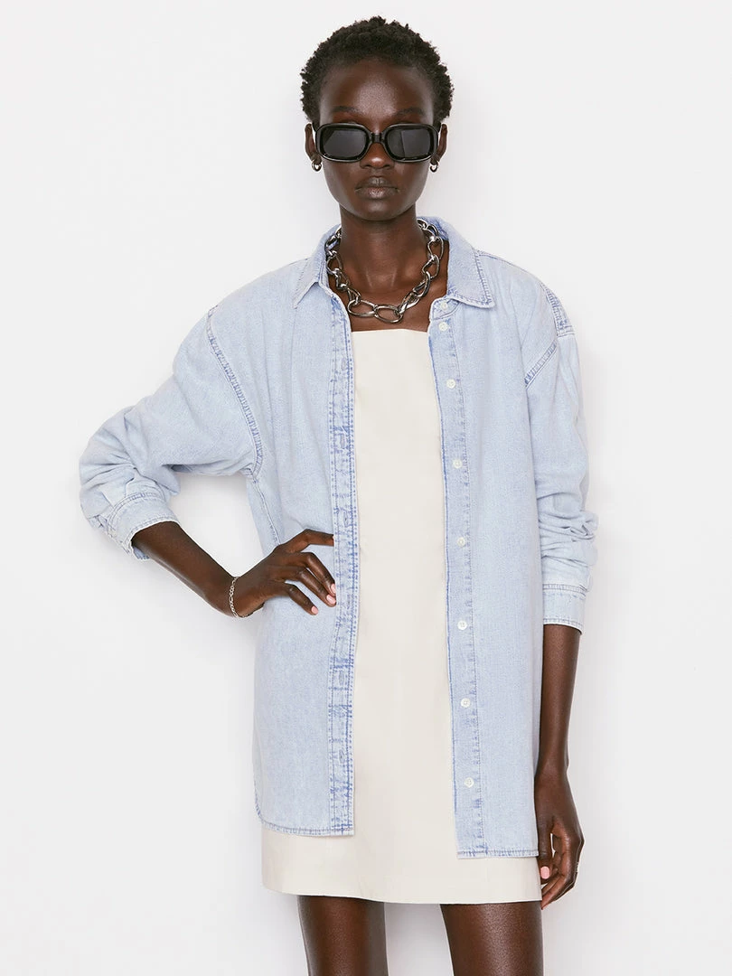 In ultra-light wash rigid denim with an oversized fit and a chic dropped shoulder, this button-down shirt features extra-long shirttailsβperfect for styling over a bikini for a beach day or wearing open over leather shorts and a bodysuit.