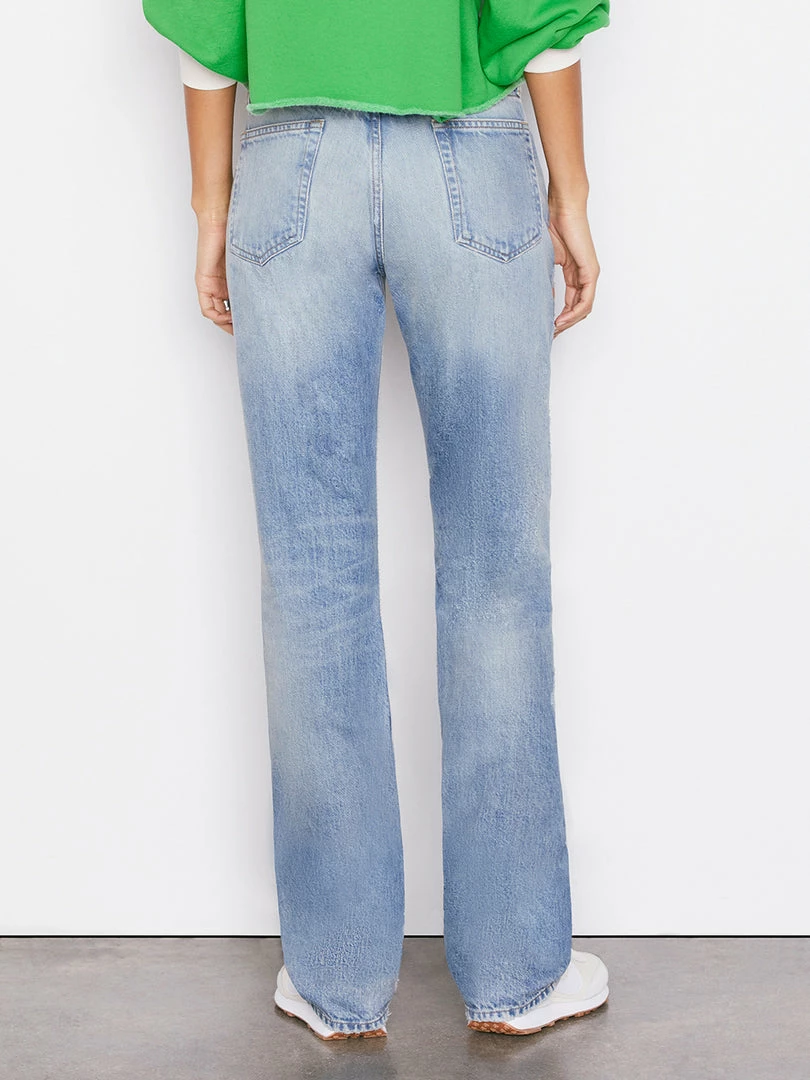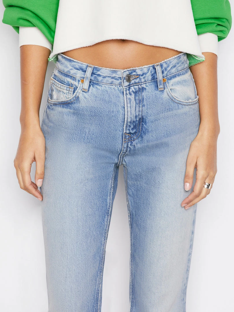 Low-rise denim is officially back. This fit hits low on the hips and features a curve-hugging fit through the waist and thighs, plus a bootcut hem for a very flattering nod to the 90s. Crafted from rigid biodegradable denim with fading at the thighs and slight destruction at the waist and pocket seams.