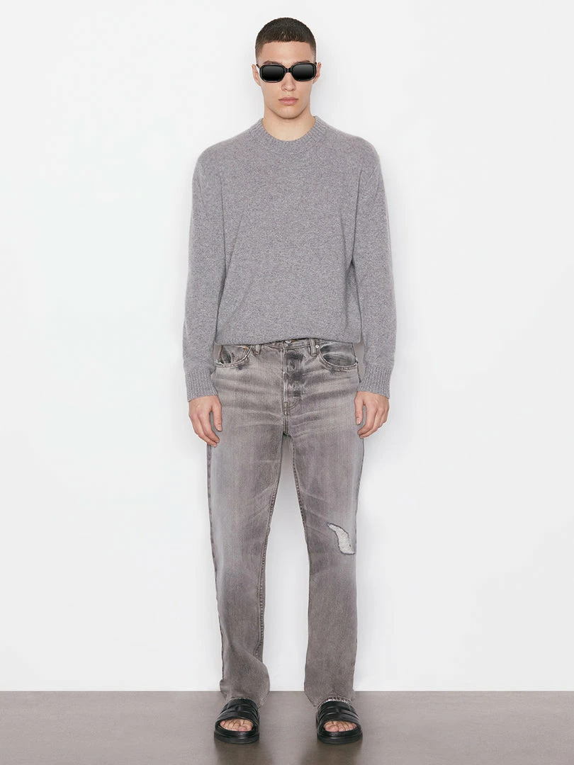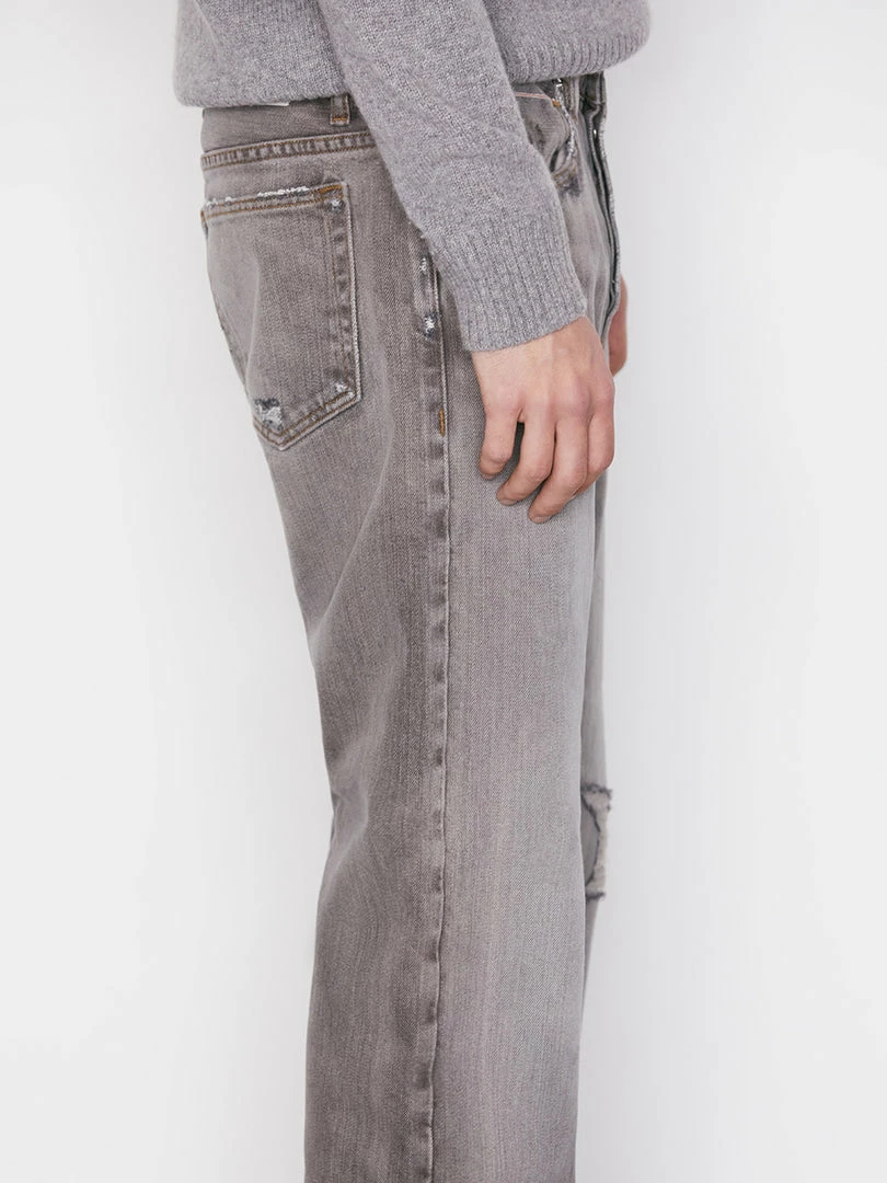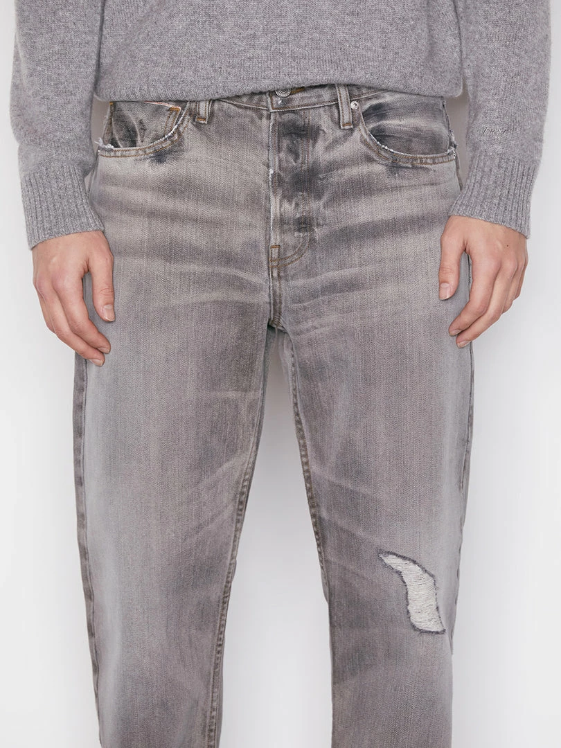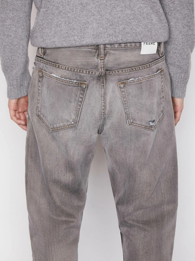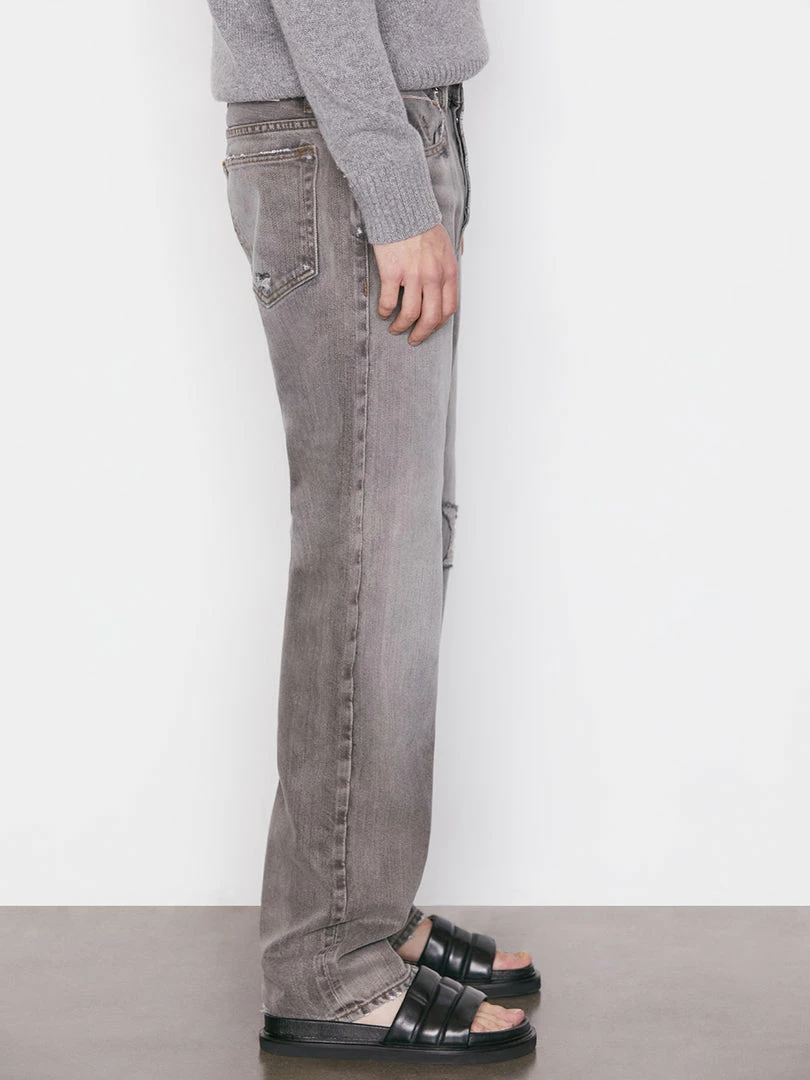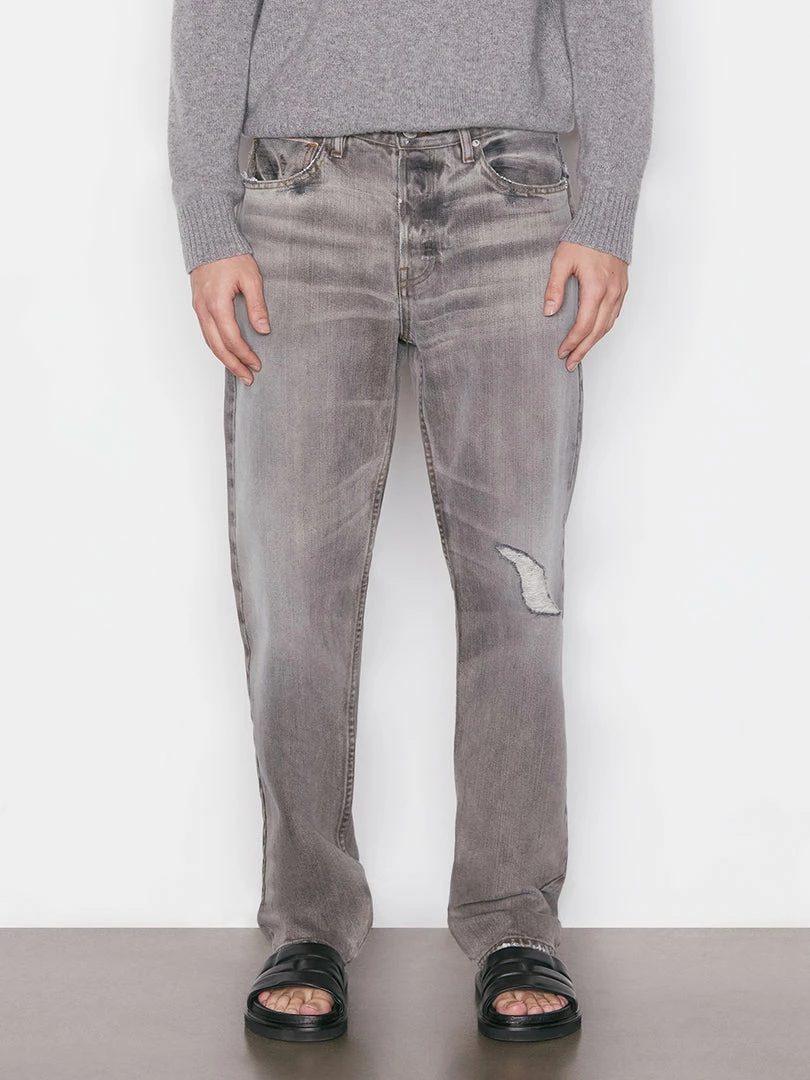 With a mid-rise fit and a straight-leg silhouette, this button-fly jean is cut from rigid denim washed to a whiskered gray fade with a single-knee shred. The Tornado wash is a style-forward summer alternative to black denim that works year round.