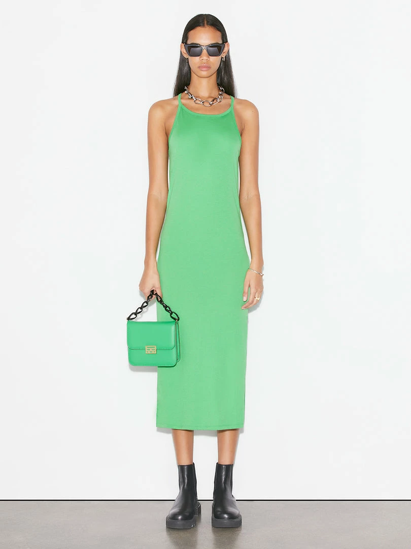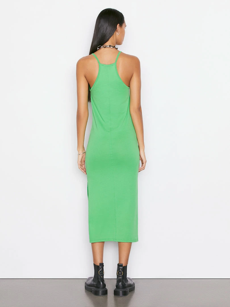 This midi-length cami dress is a closet staple youโll wear on repeat. Crafted from 100% organic pima cotton in the color of the season, Grass Green, this piece features a shelf bra and racerback straps, and can be worn on its own or layered under blazers, knits, and denim jackets.