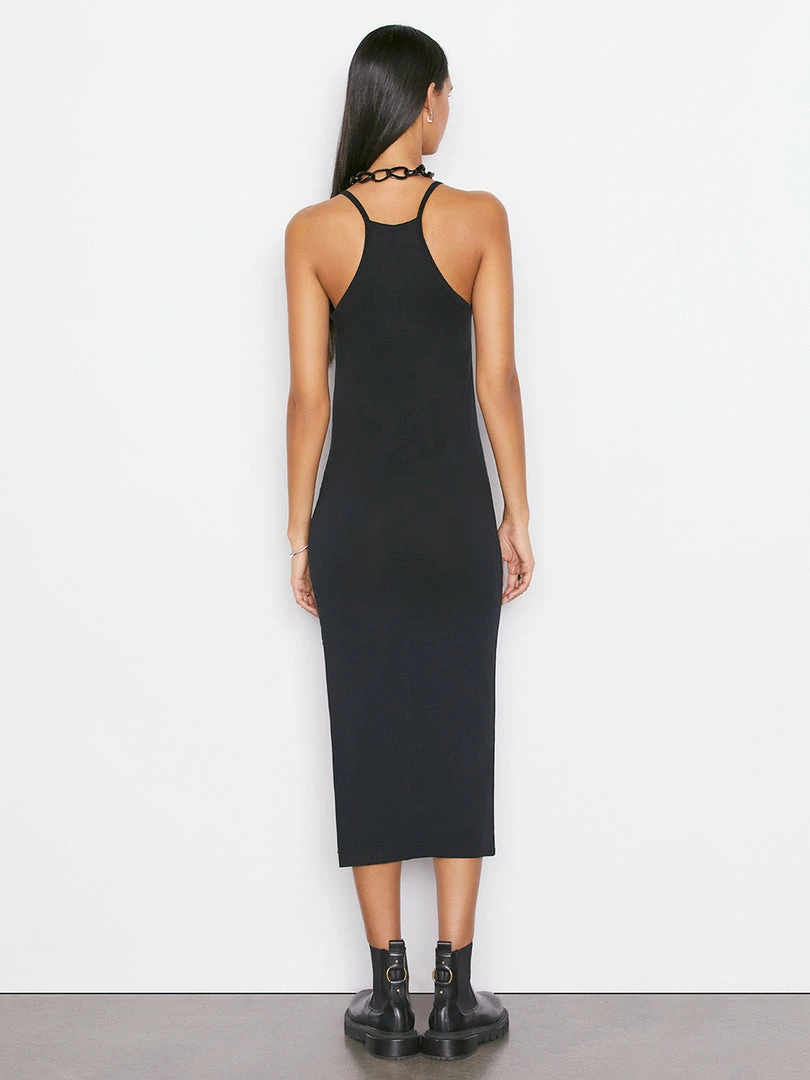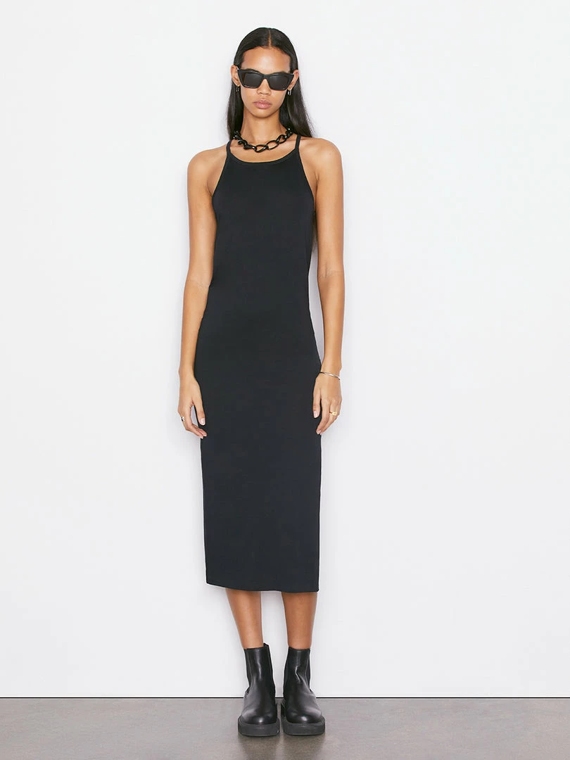 This midi-length cami dress is a closet staple you’ll wear on repeat. Crafted from 100% organic pima cotton in essential Noir, this piece features a shelf bra and racerback straps, and can be worn on its own or layered under blazers, knits, and denim jackets.