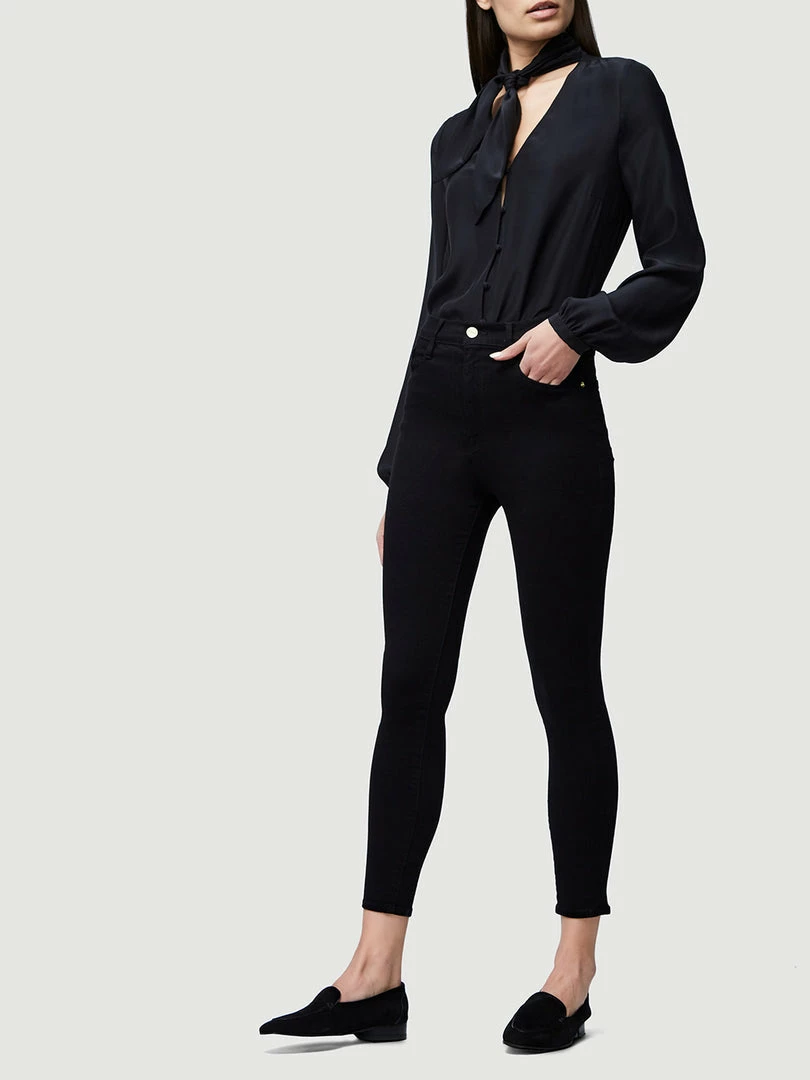 The Go-To Skinny Jean with a Slightly Cropped Silhouette in a Saturated Black Color Wash. Crafted from Super Soft Premium Denim with Super Stretch and Strong Recovery.