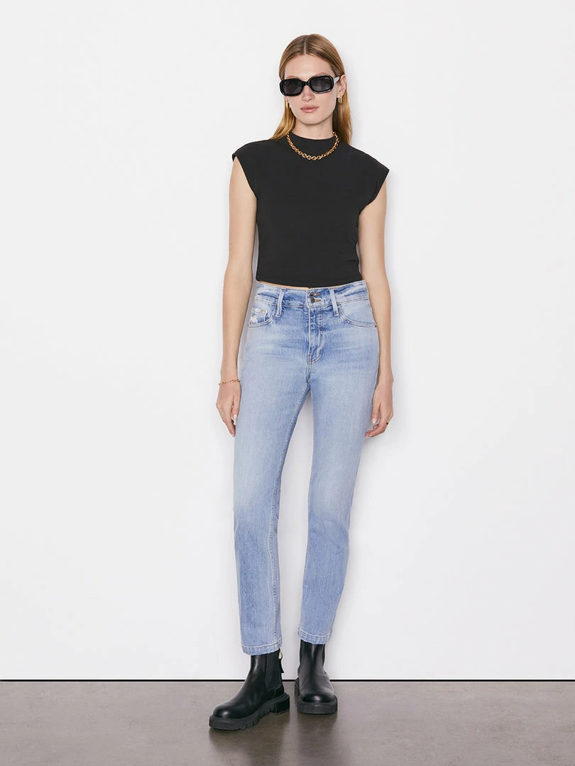 A slender straight-leg jean with a high-rise waist. Cut from a comfortable stretch fabric, this pale blue wash exudes seventies-inspired style.