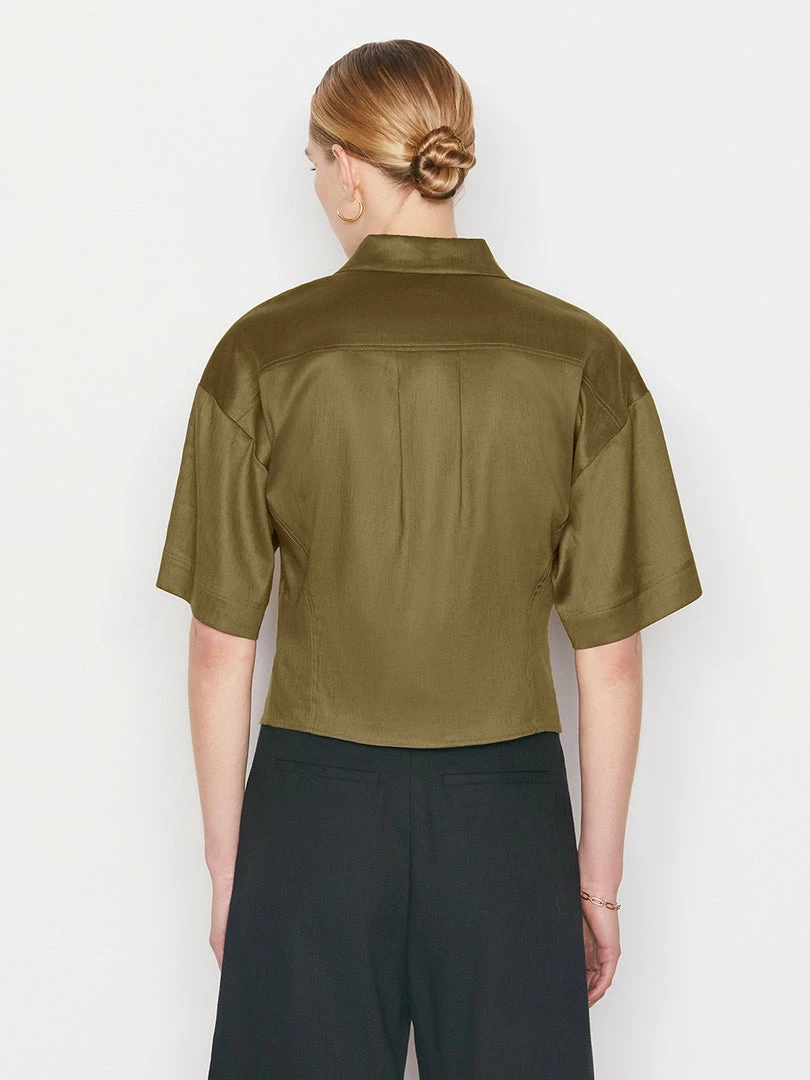 Laid-back with an elevated sheenβthanks to the lightweight linen-lyocell blendβthis cropped silhouette is finished with a pointed collar and two patch pockets with functional flaps. The button-down placket is hidden for a streamlined silhouetteβgo all in and pair yours with on-trend cargo pants.
