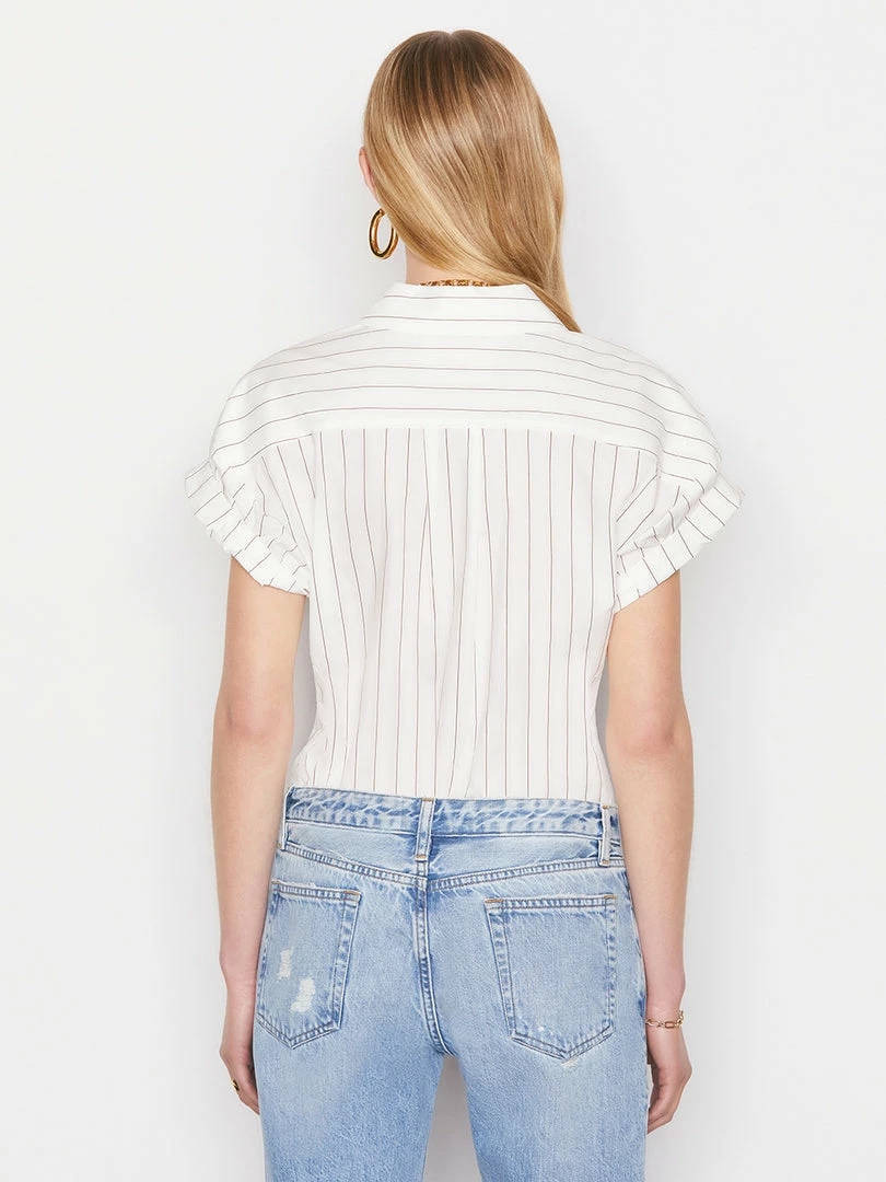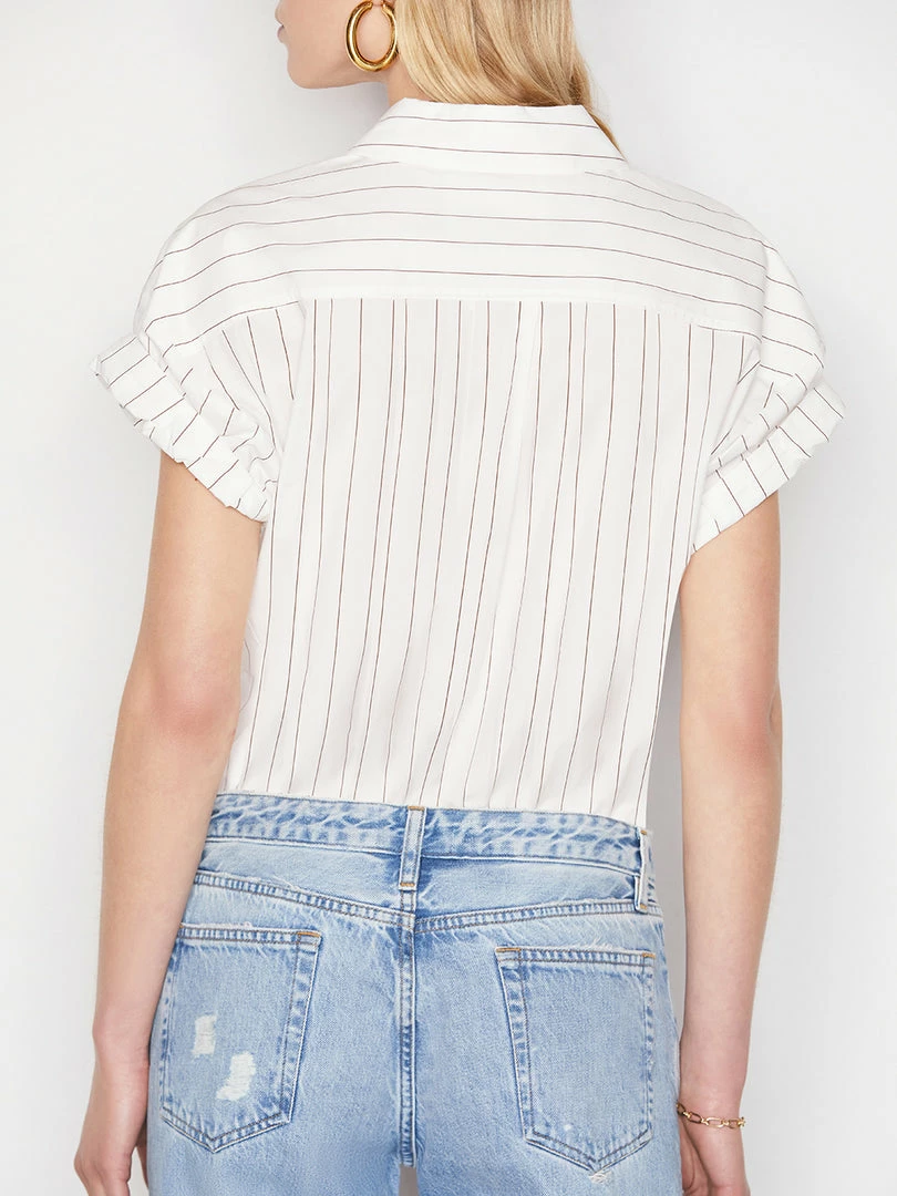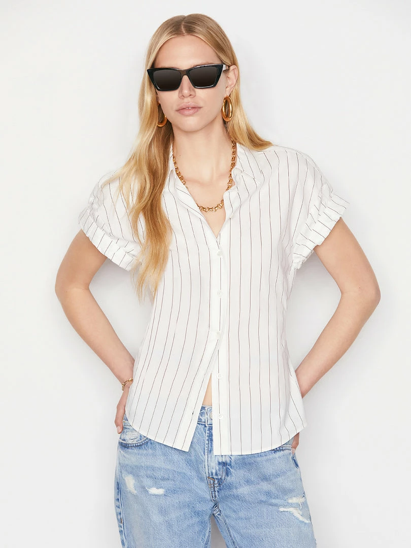 With a crisp collar, rolled sleeves, and a slight nip in at the waist, this short-sleeve button-down makes the new approach to office dressing effortless. Crafted from white organic cotton poplin with coffee-hued mini stripes, itβs equally as chic tucked into white leather cutoffs.