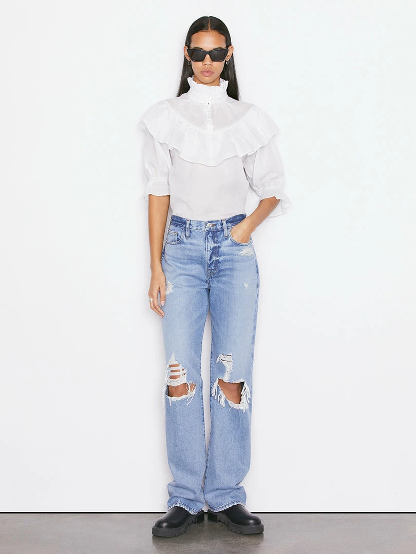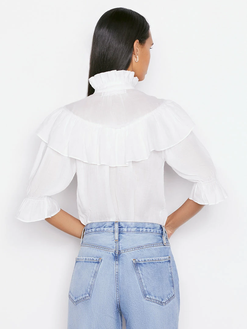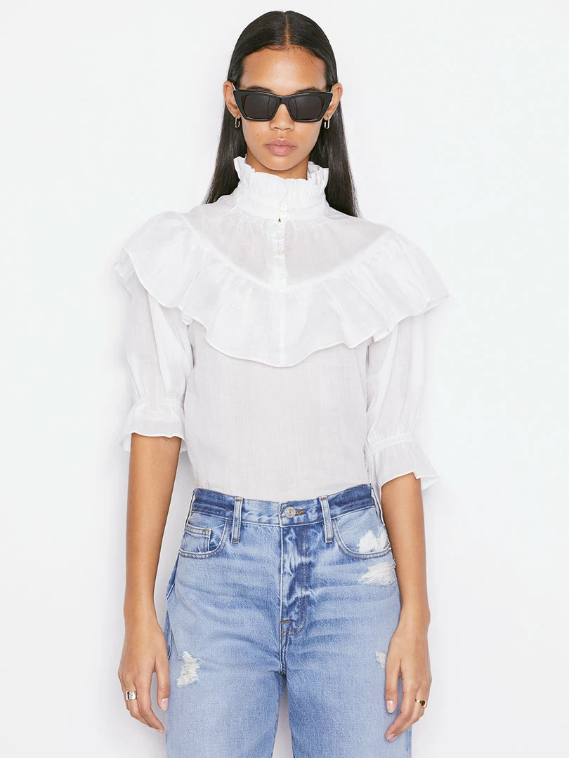 Feminine ruffles, mother-of-pearl buttons, and elasticized elbow-grazing sleeves make this high-neck top a romantic balance to raw hem cutoffs or silk boxer shorts. In lightweight ramie with a straight hem to tuck in or wear loose over, this summer-ready piece works year round under cardigans and blazers.