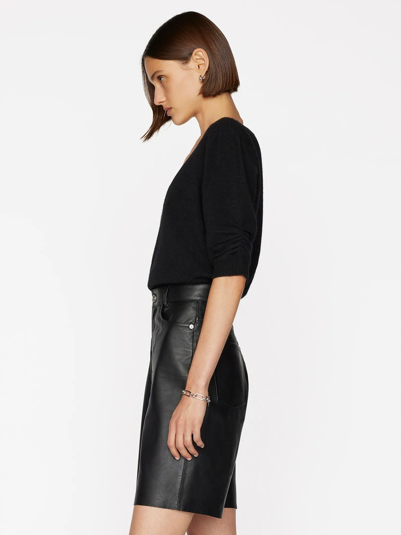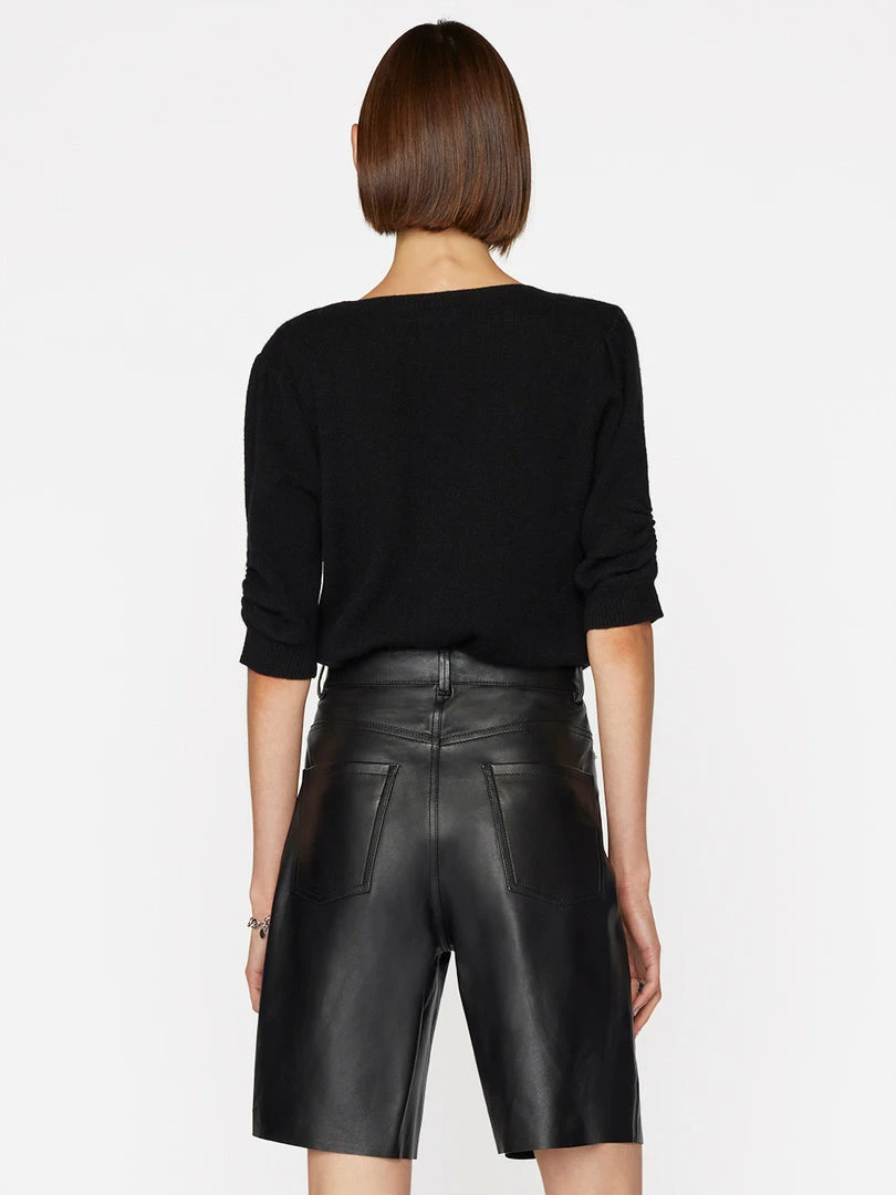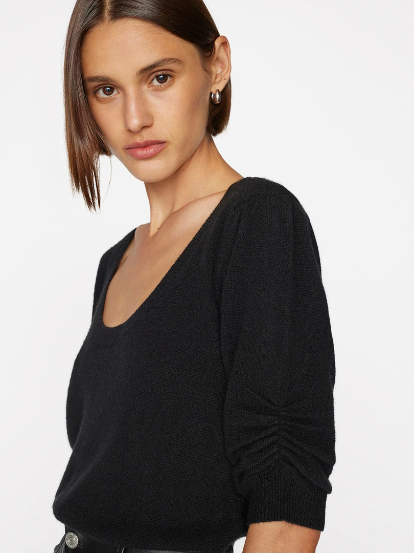 This scoop-neck sweater is knit from sustainable cashmere in closet-essential Noir. Leave the full-length hem tucked or untucked, show off your necklace stack, and enjoy the feminine shirred sleeves grazing your elbows.