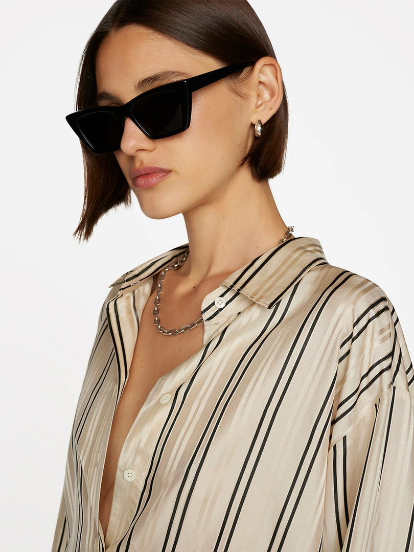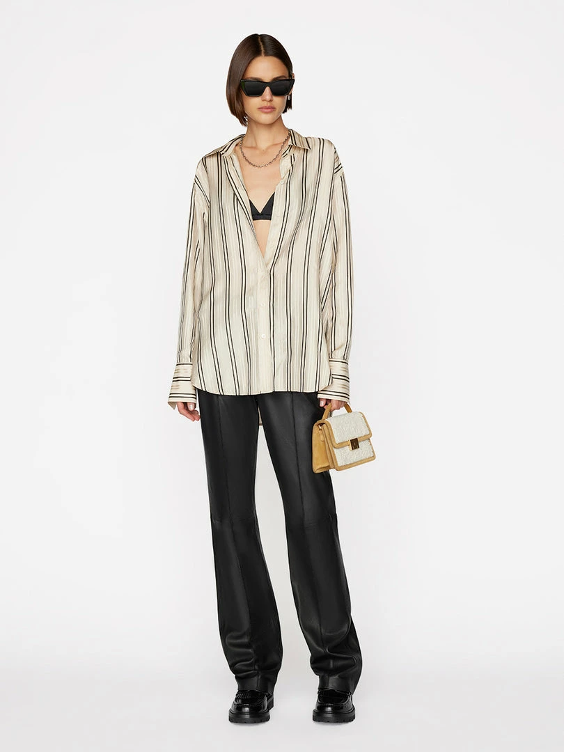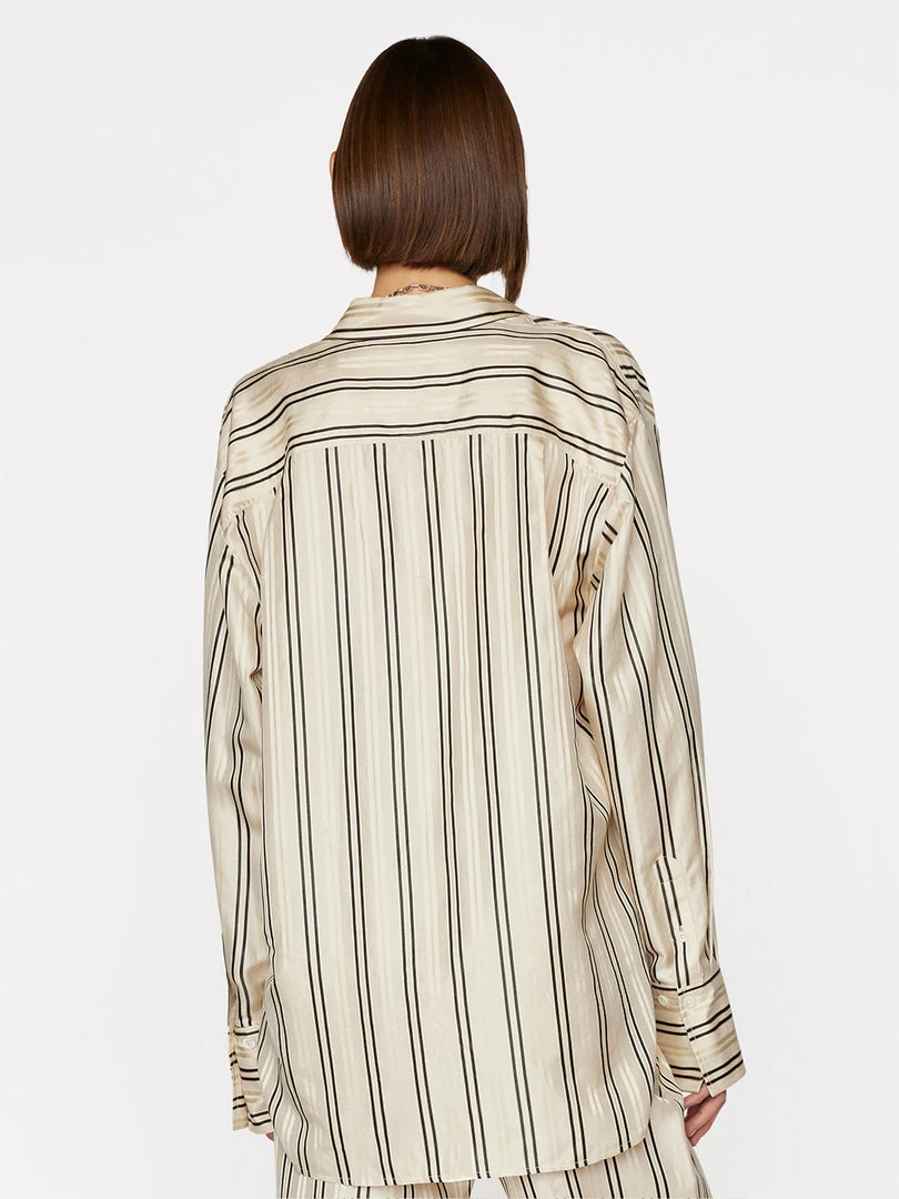 This oversized button-down silhouette is a FRAME classic, but redesigned this Fall for striking contrast. The silk jacquard stripe works year round and with everything from destructed denim to the matching high-rise safari pant.