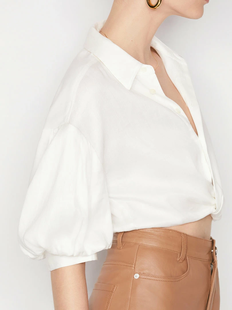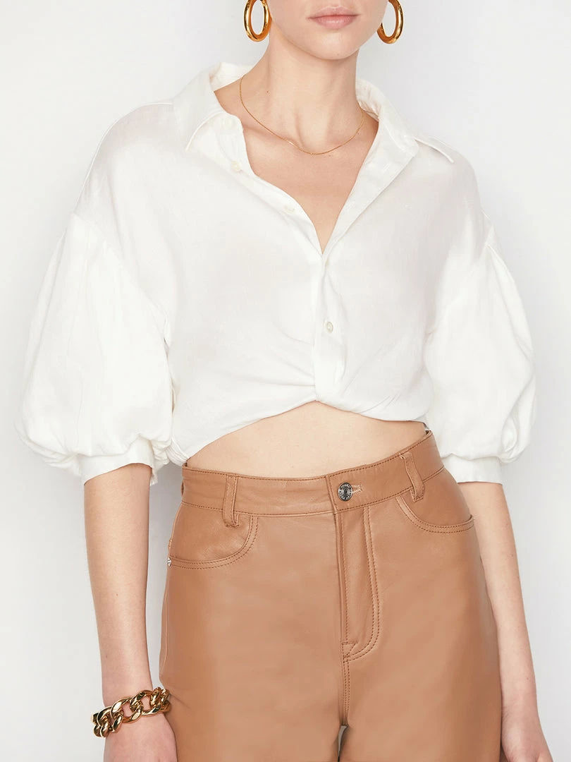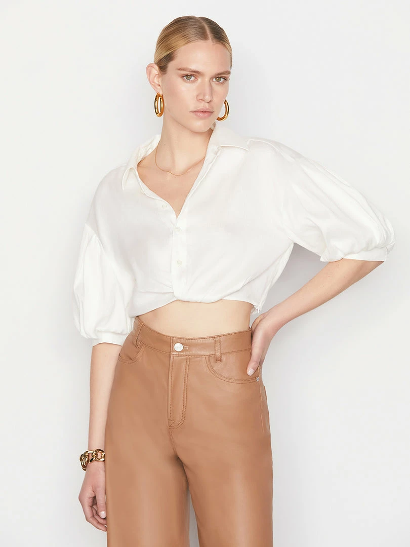 Crafted from a lightweight linen blend, this button-down shirt features a feminine puff sleeve and twisted front placket. This cropped silhouette complements high-rise denim and breezy maxis beautifully. Designed with a side zipper and smocked back panel for ease and comfort.